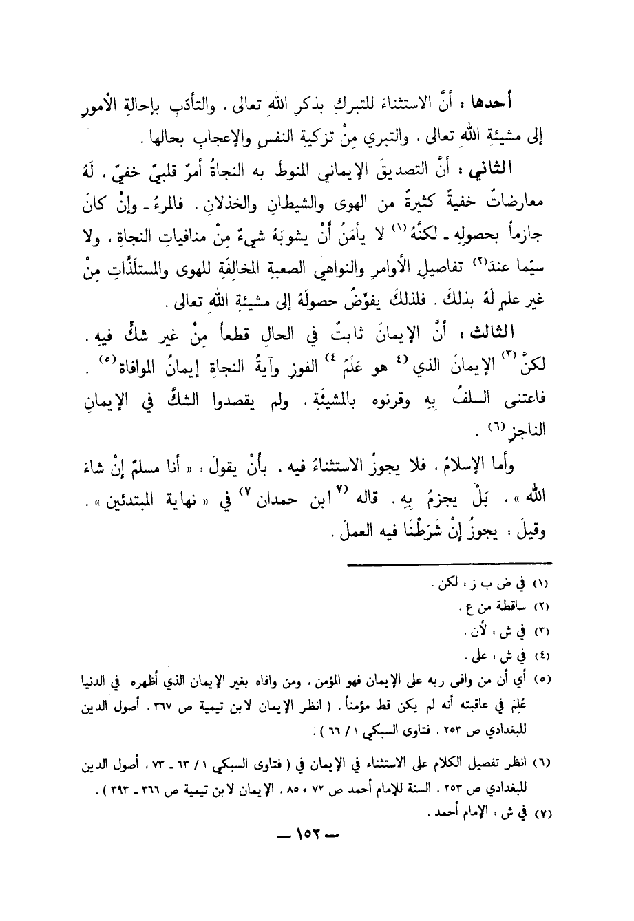 6 انظر تفصيل الكلام على الاستثناء في الإيمان في "فتاوى السبكي 1/ 63-73، أصول الدين للبغدادي ص253، السنة للإمام أحمد ص72-85، الإيمان لابن تيمية ص366-393".