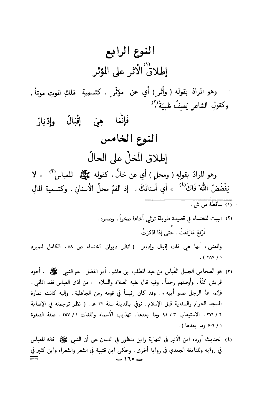 وَهُوَ الْمُرَادُ بِقَوْلِهِ "وَمَحَلٍّ" أَيْ عَنْ حَالٍّ، كَقَوْلِهِ صَلَّى اللَّهُ عَلَيْهِ وَسَلَّمَ لِلْعَبَّاسِ3 "لا يَفْضُضْ اللَّهُ فَاك4" أَيْ: أَسْنَانَك، إذْ الْفَمُ مَحَلُّ الأَسْنَانِ. وَكَتَسْمِيَةِ الْمَالِ