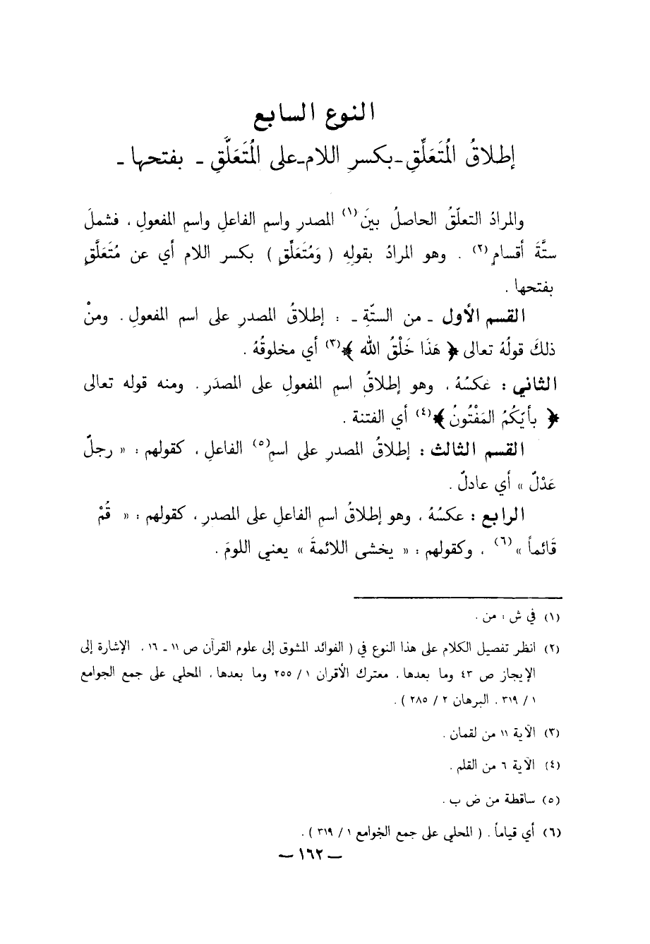 الْقِسْمُ الأَوَّلُ - مِنْ السِّتَّةِ-: إطْلاقُ الْمَصْدَرِ عَلَى اسْمِ الْمَفْعُولِ، وَمِنْ ذَلِكَ قَوْله تَعَالَى: {هَذَا خَلْقُ اللَّهِ} 3 أَيْ مَخْلُوقُهُ.