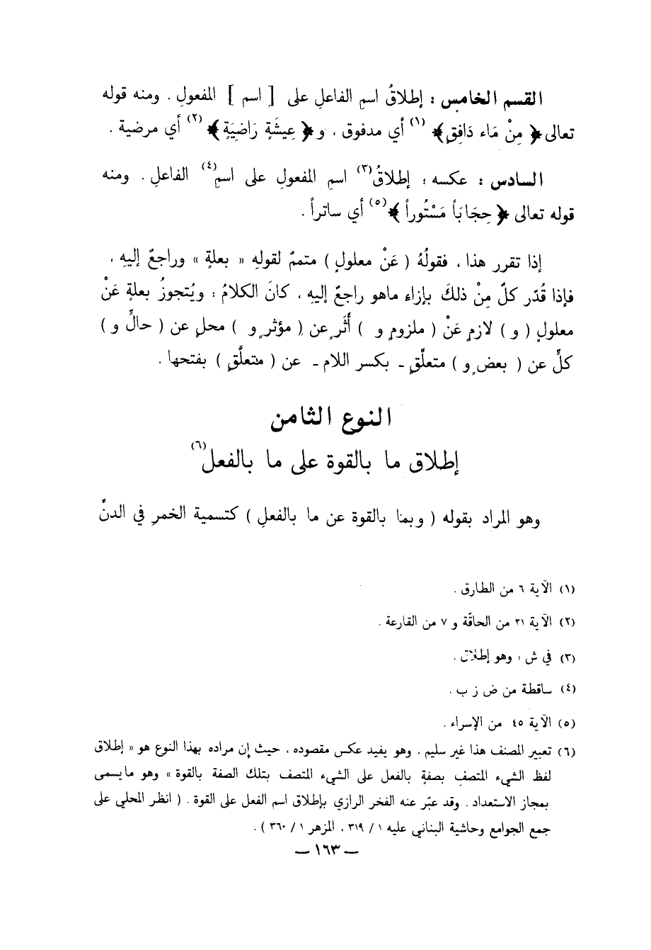 6 تعبير المصنف هذا غير سليم، وهو يفيد عكس مقصوده، حيث إن مراده بهذا النوع هو "إطلاق لفظ الشيء المتصف بصفةٍ بالفعل على الشيء المتصف بتلك الصفة بالقوة" وهو ما يسمى بمجاز الاستعداد. وقد عبّر عنه الفخر الرازي بإطلاق اسم الفعل على القوة. "انظر المحلي على جمع الجوامع وحاشية البناني عليه 1/ 319، المزهر 1/ 360".