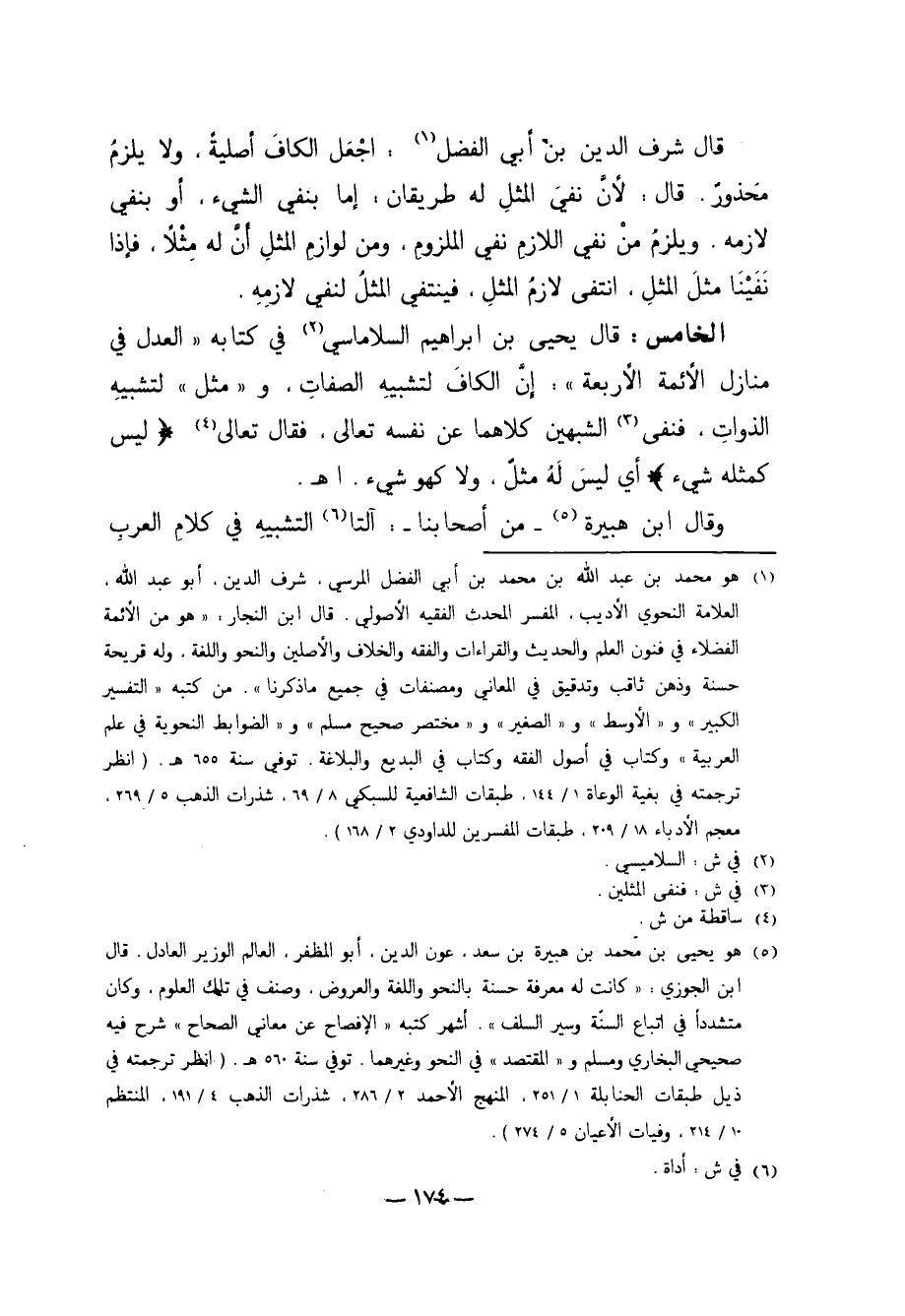 الْخَامِسُ: قَالَ يَحْيَى بْنُ إبْرَاهِيمَ السَّلامِاسِيُّ2 فِي كِتَابِهِ "الْعَدْلِ فِي مَنَازِلِ الأَئِمَّةِ الأَرْبَعَةِ": إنَّ الْكَافَ لِتَشْبِيهِ الصِّفَاتِ، وَ "مِثْلَ" لِتَشْبِيهِ الذَّوَاتِ. فَنَفَى3 الشَّبِيهَيْنِ كِلاهُمَا عَنْ نَفْسِهِ تَعَالَى. فَقَالَ تَعَالَى4: {لَيْسَ كَمِثْلِهِ شَيْءٌ} أَيْ: لَيْسَ لَهُ مِثْلٌ وَلا كَهُوَ شَيْءٌ. انْتَهَى.