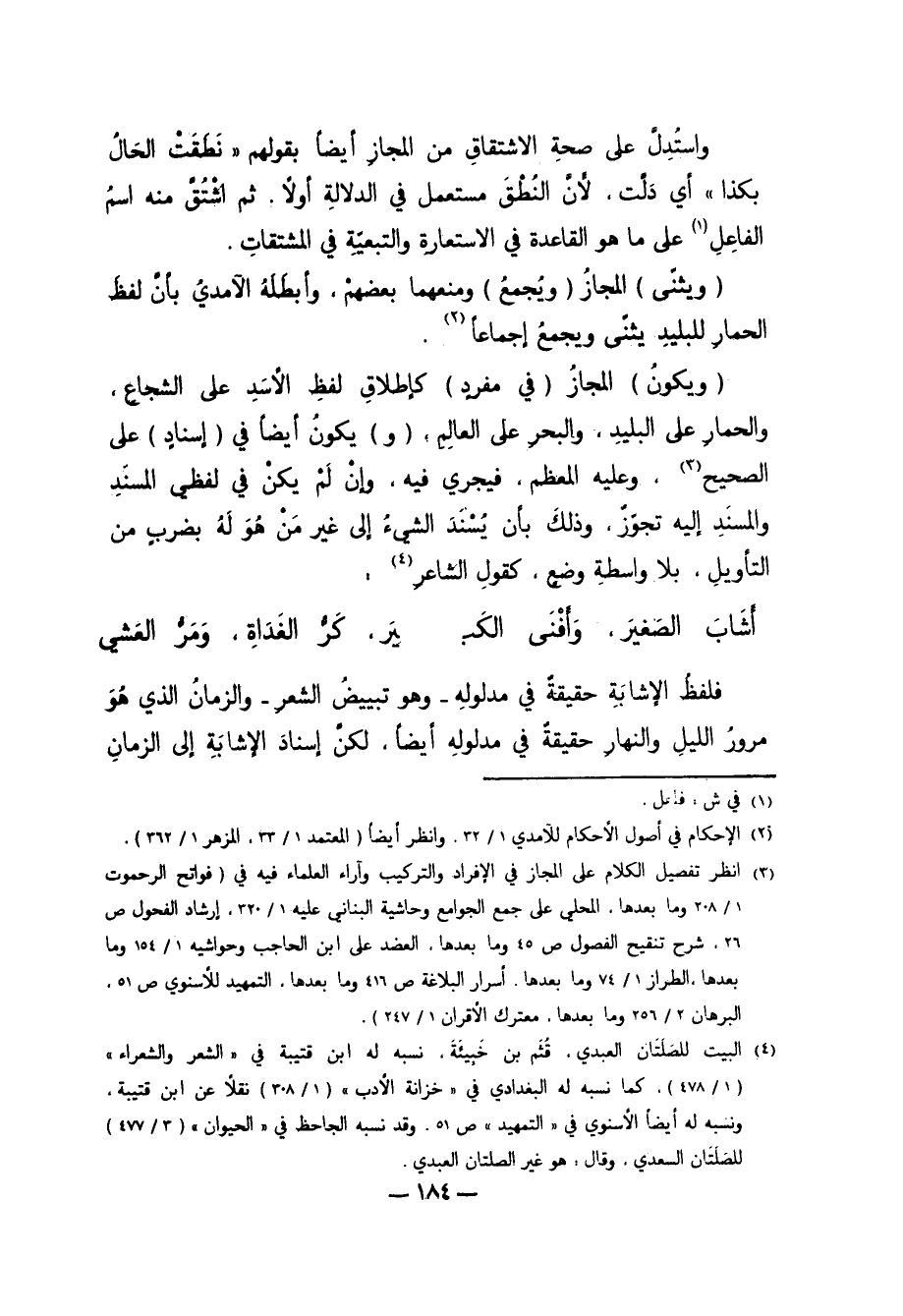 3 انظر تفصيل الكلام على المجاز في الإفراد والتركيب وآراء العلماء فيه في "فواتح الرحموت 1/ 208 وما بعدها، المحلي على جمع الجوامع وحاشية البناني عليه 1/ 320، إرشاد الفحول ص26، شرح تنقيح الفصول ص45 وما بعدها، العضد على ابن الحاجب وحواشيه 1/ 154 وما بعدها، الطراز 1/ 74 وما بعدها، أسرار البلاغة ص416 وما بعدها، التمهيد للأسنوي ص51، البرهان 2/ 256 وما بعدها، معترك الأقران 1/ 247".