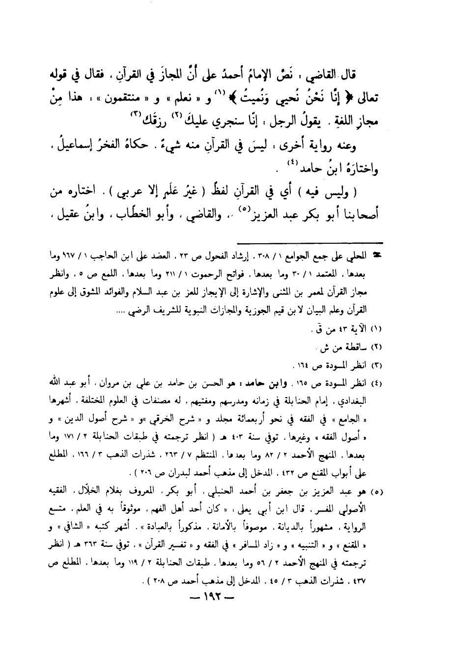 قَالَ الْقَاضِي: نَصَّ الإِمَامُ أَحْمَدُ عَلَى أَنَّ الْمَجَازَ فِي الْقُرْآنِ. فَقَالَ فِي قَوْله تَعَالَى: {إنَّا نَحْنُ نُحْيِي وَنُمِيتُ} 1 وَ "نَعْلَمُ" وَ "مُنْتَقِمُونَ": هَذَا مِنْ مَجَازِ اللُّغَةِ يَقُولُ الرَّجُلُ: إنَّا سَنُجْرِي عَلَيْكَ2 رِزْقَك3.