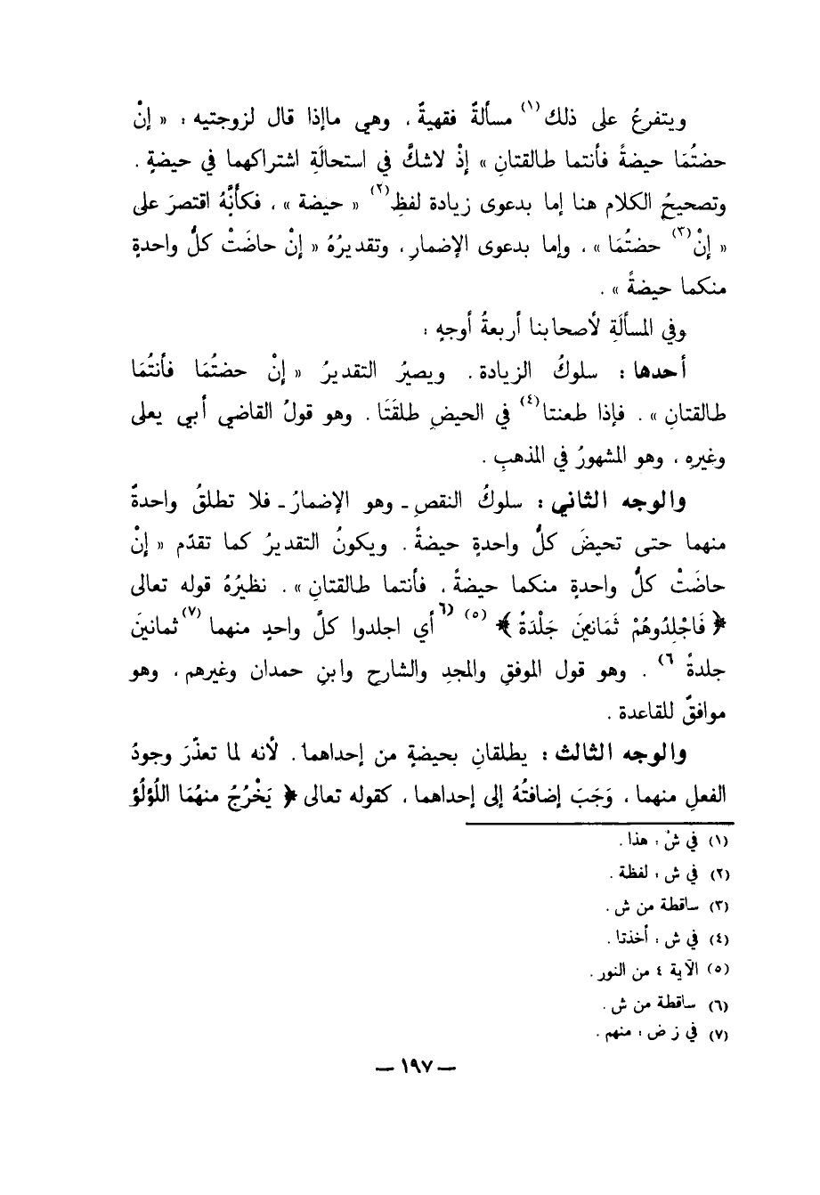 وَالْوَجْهُ الثَّانِي: سُلُوكُ النَّقْصِ، - وَهُوَ الإِضْمَارُ-، فَلا تَطْلُقُ وَاحِدَةٌ مِنْهُمَا حَتَّى تَحِيضَ كُلُّ وَاحِدَةٍ حَيْضَةً، وَيَكُونُ التَّقْدِيرُ كَمَا تَقَدَّمَ: "إنْ حَاضَتْ كُلُّ وَاحِدَةٍ مِنْكُمَا حَيْضَةً فَأَنْتُمَا طَالِقَتَانِ". نَظِيرُهُ قَوْله تَعَالَى: {فَاجْلِدُوهُمْ ثَمَانِينَ جَلْدَةً} 5 6 أَيْ اجْلِدُوا كُلَّ وَاحِدٍ مِنْهُمَا7 ثَمَانِينَ جَلْدَةً 6 وَهُوَ قَوْلُ الْمُوَفَّقِ، وَالْمَجْدِ وَالشَّارِحِ وَابْنِ حَمْدَانَ وَغَيْرِهِمْ، وَهُوَ مُوَافِقٌ لِلْقَاعِدَةِ.