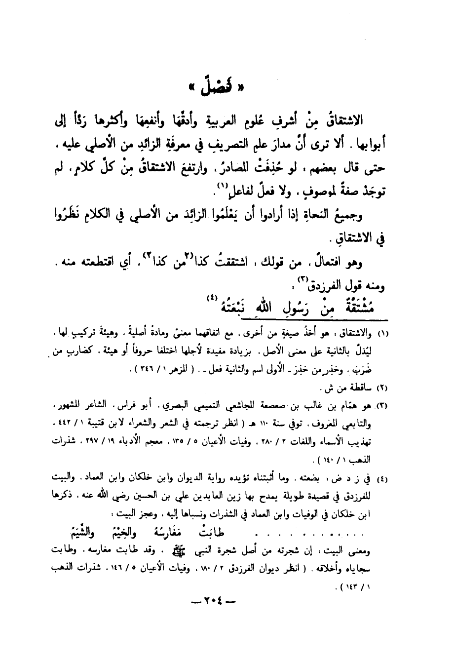 "فَصْلٌ":الاشْتِقَاقُ: مِنْ أَشْرَفِ عُلُومِ الْعَرَبِيَّةِ وَأَدَقِّهَا وَأَنْفَعِهَا، وَأَكْثَرِهَا رَدًّا إلَى أَبْوَابِهَا، أَلا تَرَى أَنَّ مَدَارَ عِلْمِ التَّصْرِيفِ فِي مَعْرِفَةِ الزَّائِدِ مِنْ الأَصْلِيِّ عَلَيْهِ، حَتَّى قَالَ بَعْضُهُمْ: لَوْ حُذِفَتْ الْمَصَادِرُ، وَارْتَفَعَ الاشْتِقَاقُ مِنْ كُلِّ كَلامٍ: لَمْ تُوجَدْ صِفَةٌ لِمَوْصُوفٍ، وَلا فِعْلٌ لِفَاعِلٍ1.