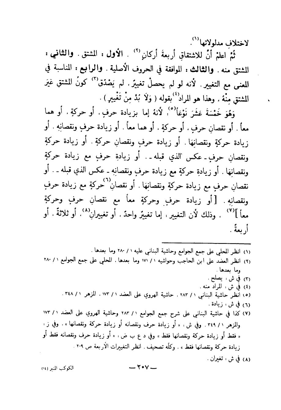 ثُمَّ اعْلَمْ أَنَّ لِلاشْتِقَاقِ أَرْبَعَةَ أَرْكَانٍ2. الأَوَّلُ: الْمُشْتَقُّ. وَالثَّانِي: الْمُشْتَقُّ مِنْهُ. وَالثَّالِثُ: الْمُوَافَقَةُ فِي الْحُرُوفِ الأَصْلِيَّةِ. وَالرَّابِعُ: الْمُنَاسَبَةُ فِي الْمَعْنَى مَعَ التَّغْيِيرِ، لأَنَّهُ لَوْ لَمْ يَحْصُلْ تَغْيِيرٌ لَمْ يَصْدُقْ3 كَوْنُ الْمُشْتَقِّ غَيْرَ الْمُشْتَقِّ مِنْهُ. وَهَذَا هُوَ الْمُرَادُ4 بِقَوْلِهِ "وَلا بُدَّ مِنْ تَغْيِيرٍ".