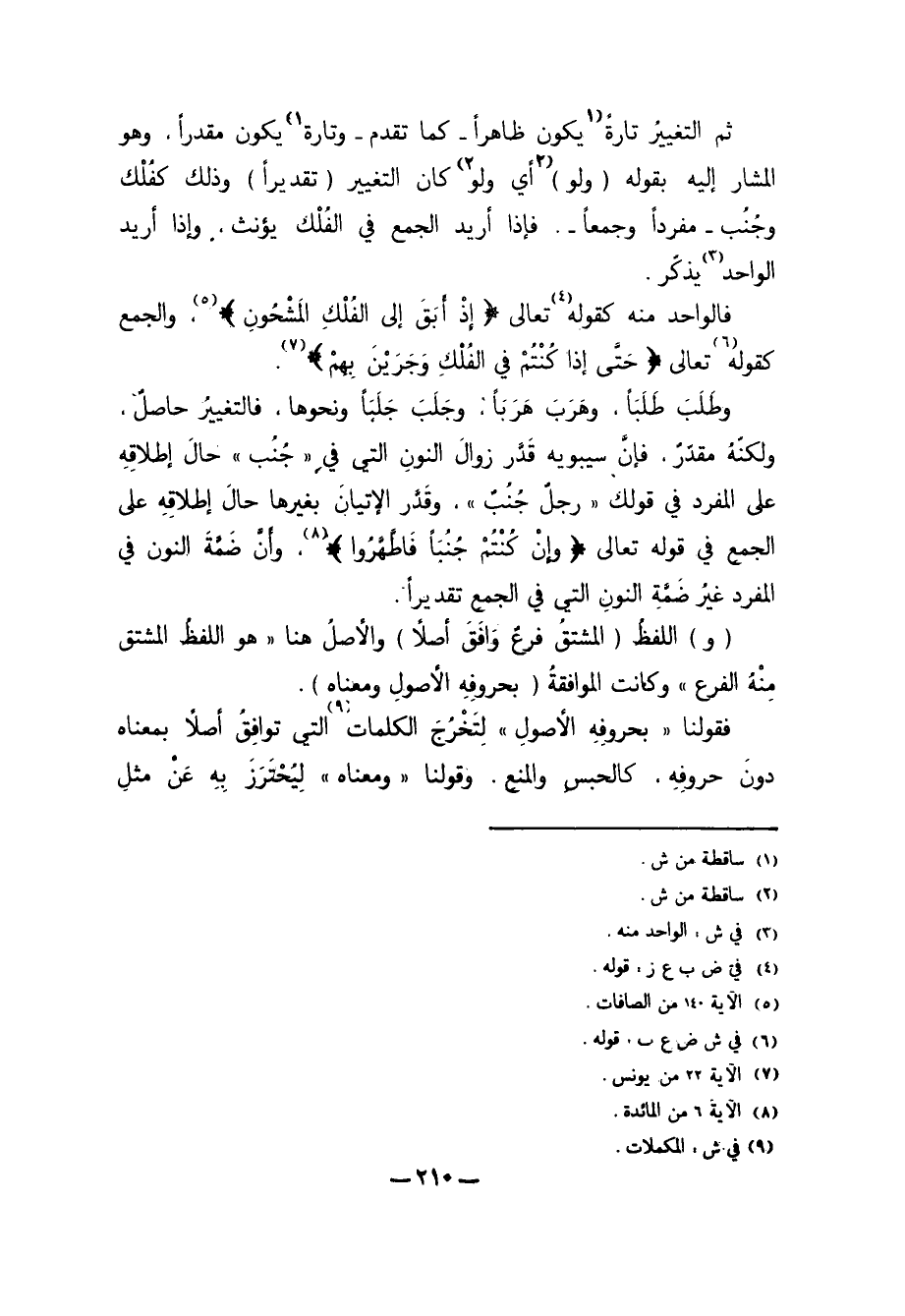 ثُمَّ التَّغْيِيرُ تَارَةً 1 يَكُونُ ظَاهِرًا - كَمَا تَقَدَّمَ – وَتَارَةً 1 يَكُونُ مُقَدَّرًا، وَهُوَ الْمُشَارُ إلَيْهِ بِقَوْلِهِ "وَلَوْ" "أَيْ وَلَوْ"2 كَانَ التَّغْيِيرُ "تَقْدِيرًا" وَذَلِكَ: كَفُلْكٍ وَجُنُبٍ، - مُفْرَدًا وَجَمْعًا -، فَإِذَا أُرِيدَ الْجَمْعُ فِي الْفُلْكِ يُؤَنَّثُ، وَإِذَا أُرِيدَ الْوَاحِدُ3 يُذَكَّرُ.
