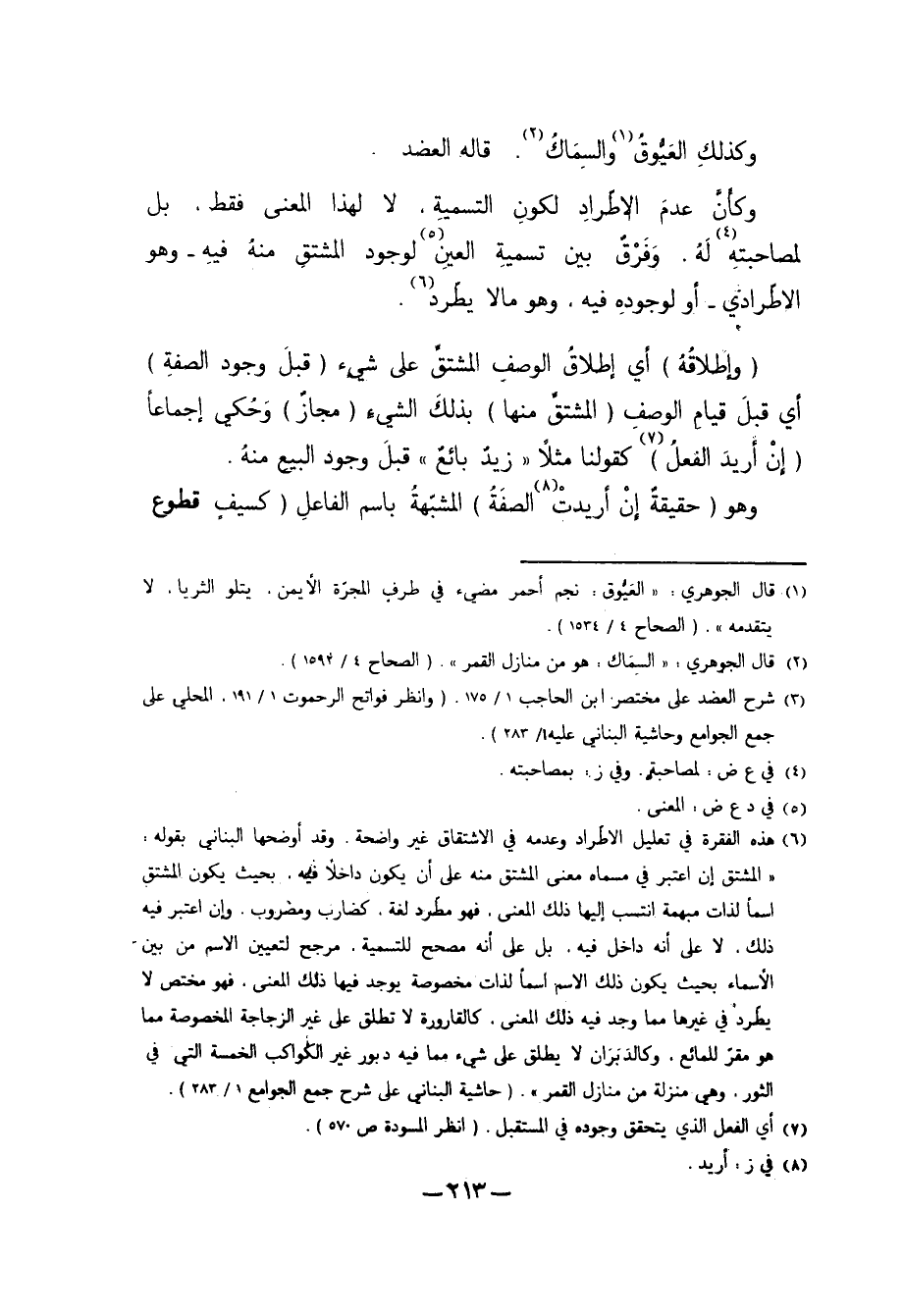 6 هذه الفقرة في تعليل الاطُّراد وعدمه في الاشتقاق غير واضحة. وقد أوضحها البناني بقوله: "المشتق إن اعتبر في مسماه معنى المشتق منه على أن يكون داخلاً فيه، بحيث يكون المشتق اسماً لذات مبهمة انتسب إليها ذلك المعنى، فهو مطّرد لغة، كضارب ومضروب، وإن اعتبر فيه ذلك، لا على أنه داخل فيه، بل على أنه مصحح للتسمية، مرجع لتعيين الاسم من بين الأسماء بحيث يكون ذلك الاسم اسماً لذات مخصوصة يوجد فيها ذلك المعنى، فهو مختص لا يطّرد في غيرها مما وجد في ذلك المعنى، كالقارورة لا تطلق على غير الزجاجة المخصوصة مما هو مقرّ للمائع، وكالدَبَرَان لا يطلق على شيء مما فيه دبور غير الكواكب الخمس التي في الثور، وهي منزلة من منازل القمر". "حاشية البناني على شرح جمع الجوامع 1/ 183".