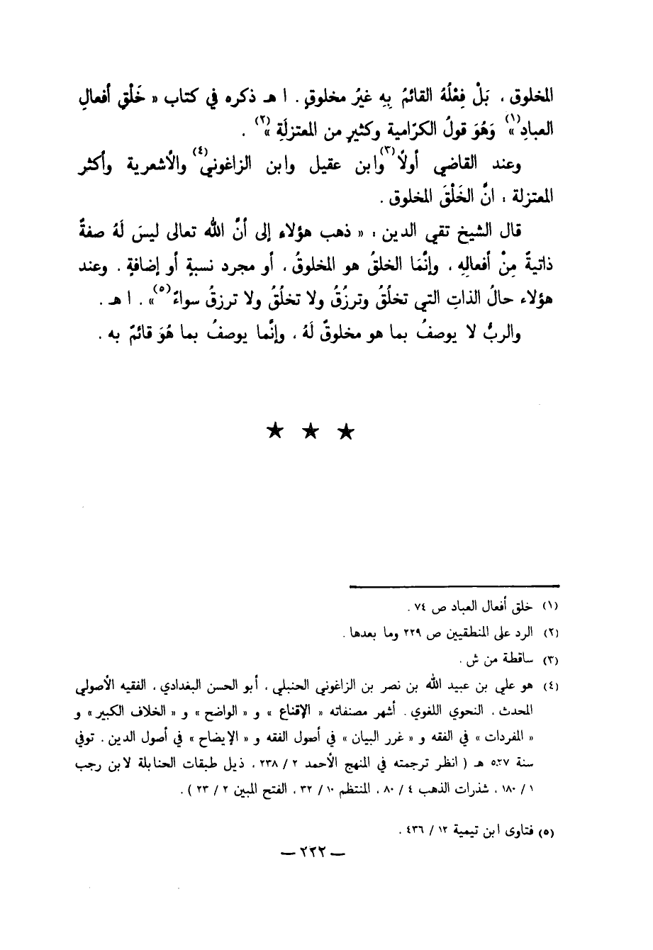 قَالَ الشَّيْخُ تَقِيُّ الدِّينِ: "ذَهَبَ هَؤُلاءِ إلَى أَنَّ اللَّهَ تَعَالَى لَيْسَ لَهُ صِفَةٌ ذَاتِيَّةٌ مِنْ أَفْعَالِهِ وَإِنَّمَا الْخَلْقُ هُوَ الْمَخْلُوقُ، أَوْ مُجَرَّدُ نِسْبَةٍ، أَوْ إضَافَةٍ، وَعِنْدَ هَؤُلاءِ: حَالُ الذَّاتِ الَّتِي تَخْلُقُ وَتَرْزُقُ وَلا تَخْلُقُ وَلا تَرْزُقُ سَوَاءٌ5". انْتَهَى.