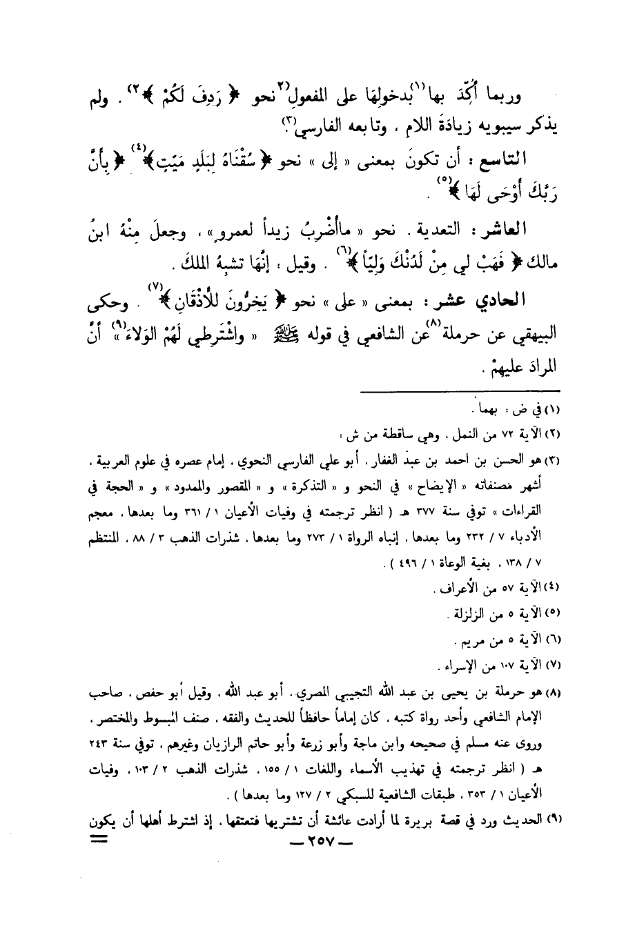 8 هو حرملة بن يحيى بن عبد الله التجيبي المصري، أبو عبد الله، وقيل أبو حفص، صاحب الإمام الشافعي وأحد رواة كتبه، كان إماماً حافظاً للحديث والفقه، صنف المبسوط والمختصر، وروى عنه مسلم في صحيحه وابن ماجة وأبو زرعة وأبو حاتم الرازيان وغيرهم. توفي سنة 243هـ. "انظر ترجمته في تهذيب الأسماء واللغات 1/ 155، شذرات الذهب 2/ 103، وفيات الأعيان 1/ 353، طبقات الشافعية للسبكي 2/ 127 وما بعدها".