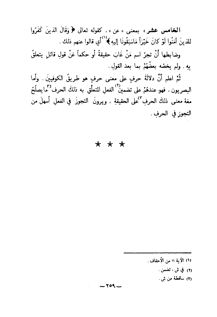 ثُمَّ اعْلَمْ أَنَّ دَلالَةَ حَرْفٍ عَلَى مَعْنَى حَرْفٍ: هُوَ طَرِيقُ الْكُوفِيِّينَ. وَأَمَّا الْبَصْرِيُّونَ: فَهُوَ عِنْدَهُمْ عَلَى تَضْمِينِ2 الْفِعْلِ الْمُتَعَلِّقِ بِهِ ذَلِكَ الْحَرْفُ 3 مَا يَصْلُحُ مَعَهُ مَعْنَى ذَلِكَ الْحَرْفِ 3 عَلَى الْحَقِيقَةِ، وَيَرَوْنَ التَّجَوُّزَ فِي الْفِعْلِ أَسْهَلَ مِنْ التَّجَوُّزِ فِي الْحَرْفِ.