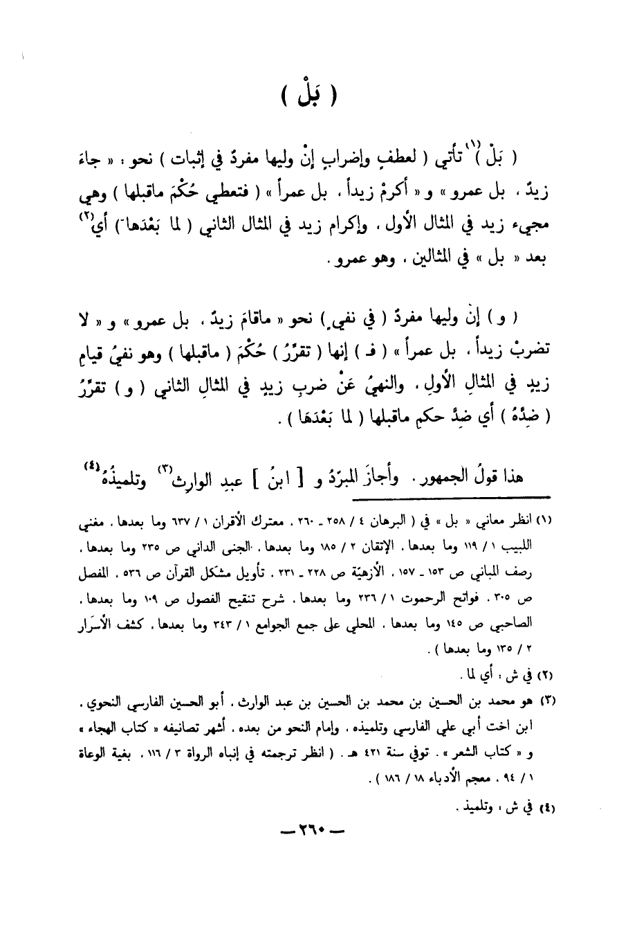 1 انظر معاني "بل" في "البرهان 4/ 258-260، معترك الأقران 1/ 637 وما بعدها، مغني اللبيب 1/ 119 وما بعدها، الإتقان 2/ 185 وما بعدها، الجنى الداني ص235 وما بعدها، رصف المباني ص153-157، الأزهيّة ص228-231، تأويل مشكل القرآن ص536، المفصل ص305، فواتح الرحموت 1/ 236 وما بعدها، شرح تنقيح الفصول ص109 وما بعدها، الصاحبي ص145 وما بعدها، المحلي على جمع الجوامع 1/ 343 وما بعدها، كشف الأسرار 2/135 وما بعدها".