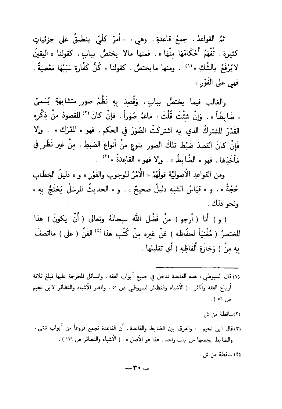 ثُمَّ الْقَوَاعِدُ: جَمْعُ قَاعِدَةٍ، وَهِيَ "أَمْرٌ كُلِّيٌّ يَنْطَبِقُ عَلَى جُزْئِيَّاتٍ كَثِيرَةٍ تُفْهَمُ أَحْكَامُهَا مِنْهَا". فَمِنْهَا: مَا لا يَخْتَصُّ بِبَابٍ. كَقَوْلِنَا "الْيَقِينُ لا يُرْفَعُ بِالشَّكِّ"1، وَمِنْهَا: مَا يَخْتَصُّ، كَقَوْلِنَا "كُلُّ كَفَّارَةٍ سَبَبُهَا مَعْصِيَةٌ، فَهِيَ عَلَى الْفَوْرِ".