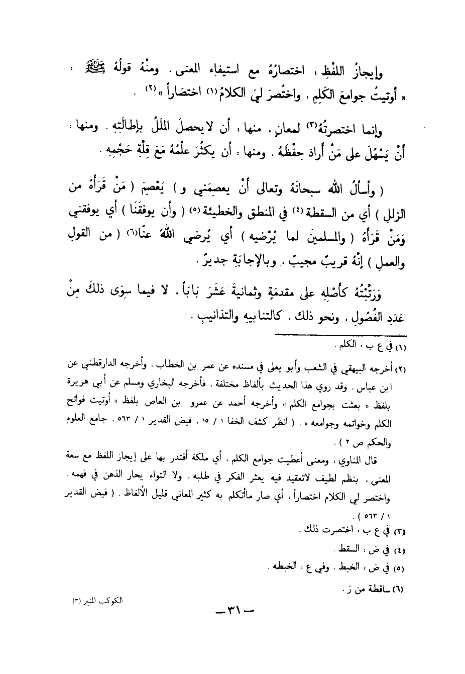 2 أخرجه البيهقي في الشعب وأبو يعلى في مسنده عن عمر بن الخطاب، وأخرجه الدارقطني عن ابن عباس. وقد روي هذا الحديث بألفاظ مختلفة، فأخرجه البخاري ومسلم عن أبي هريرة بلفظ "بعثت بجوامع الكلم" وأخرجه أحمد عن عمرو بن العاص بلفظ "أوتيت فوتح الكلم وخواتمه وجوامعه". "انظر كشف الخفا 1/ 15، فيض القدير 1/ 563، جامع العلوم والحكم ص2".