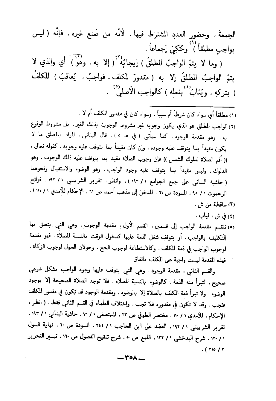 والقسم الثاني: مقدمة الوجود، وهي التي يتوقف عليها وجود الواجب بشكل شرعي صحيح، لتبرأ منه الذمة، كالوضوء بالنسبة للصلاة، فلا توجد الصلاة الصحيحة إلا بوجود الوضوء، ولا تبرأ ذمة المكلف بالصلاة إلا بالوضوء، ومقدمة الوجود قد تكون في مقدور المكلف فتجب، وقد لا تكون في مقدوره فلا تجب، واختلاف العلماء في القسم الثاني فقط. "انظر: الإحكام، للآمدي 1/ 110، مختصر الطوفي ص23، المستصفى 1/ 71، حاشية البناني 1/ 193، تقرير الشربيني 1/ 193، العضد على ابن الحاجب 1/244، المسودة ص60، نهاية السول 1/ 170، شرح البدخشي 1/ 122، اللمع ص10، شرح تنقيح الفصول ص160، تيسير التحرير 2/ 215".