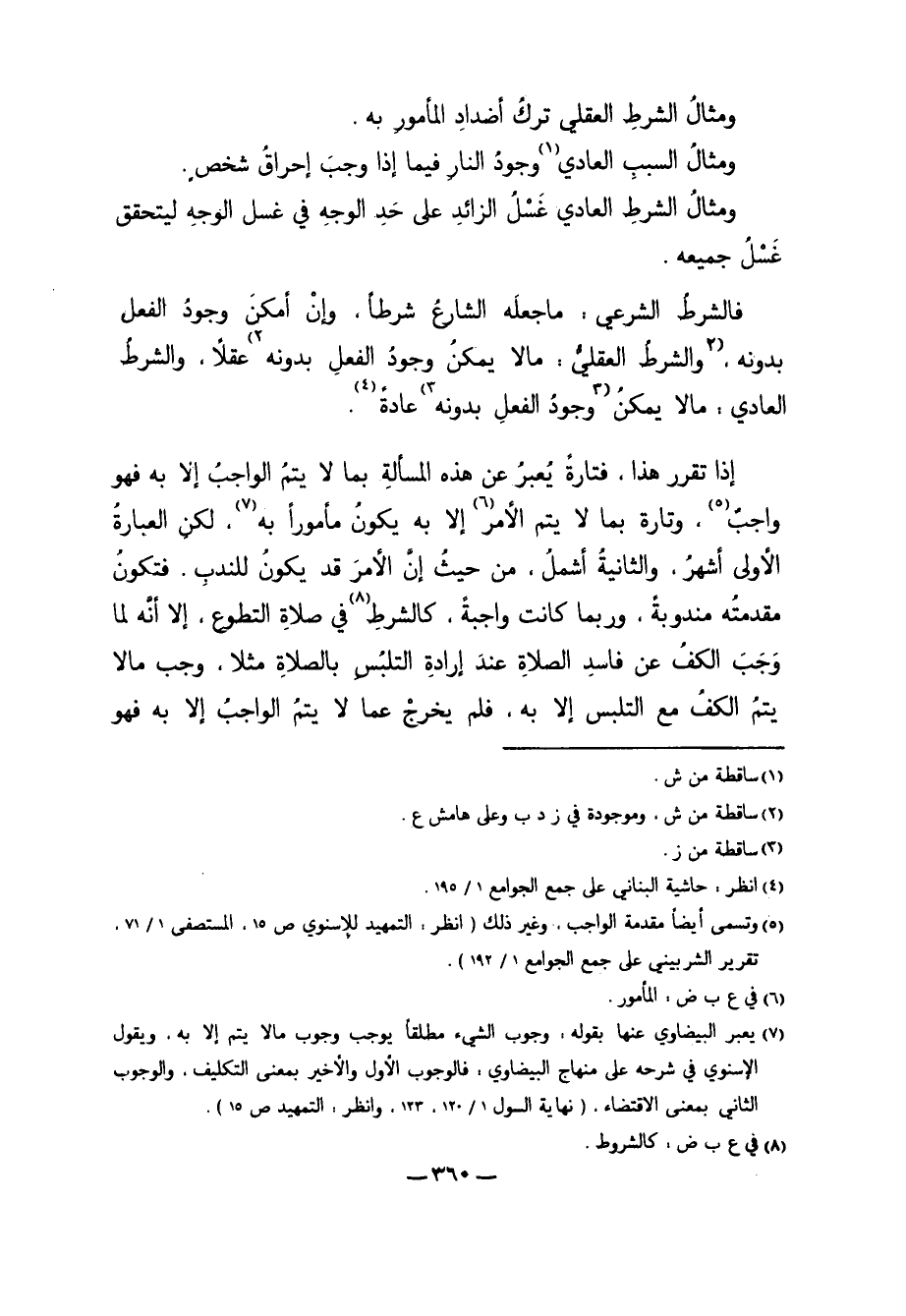 فَالشَّرْطُ الشَّرْعِيُّ: مَا جَعَلَهُ الشَّارِعُ شَرْطًا، وَإِنْ أَمْكَنَ وُجُودُ الْفِعْلِ بِدُونِهِ 2 وَالشَّرْطُ الْعَقْلِيُّ: مَا لا يُمْكِنُ وُجُودُ الْفِعْلِ بِدُونِهِ"2 عَقْلاً، وَالشَّرْطُ الْعَادِيُّ: مَا لا يُمْكِنُ 3 وُجُودُ الْفِعْلِ بِدُونِهِ"3 عَادَةً4.