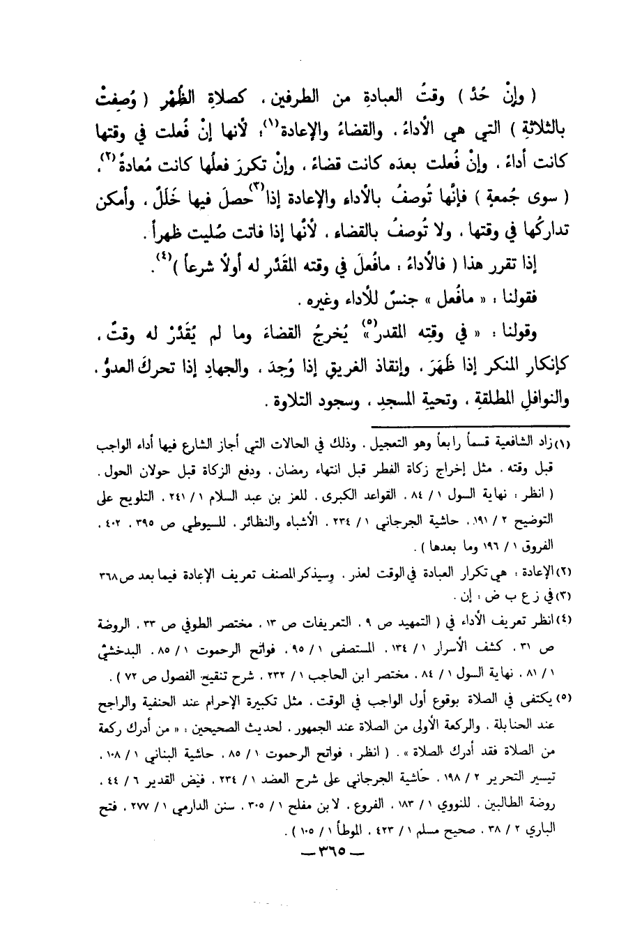 4 انظر تعريف الأداء في "التمهيد ص9، التعريفات ص13، مختصر الطوفي ص33، الروضة ص31، كشف الأسرار 1/ 134، المستصفى 1/ 95، فواتح الرحموت 1/ 85، البدخشي 1/ 81، نهاية السول 1/ 84، مختصر ابن الحاجب 1/ 232، شرح تنقيح الفصول ص72".