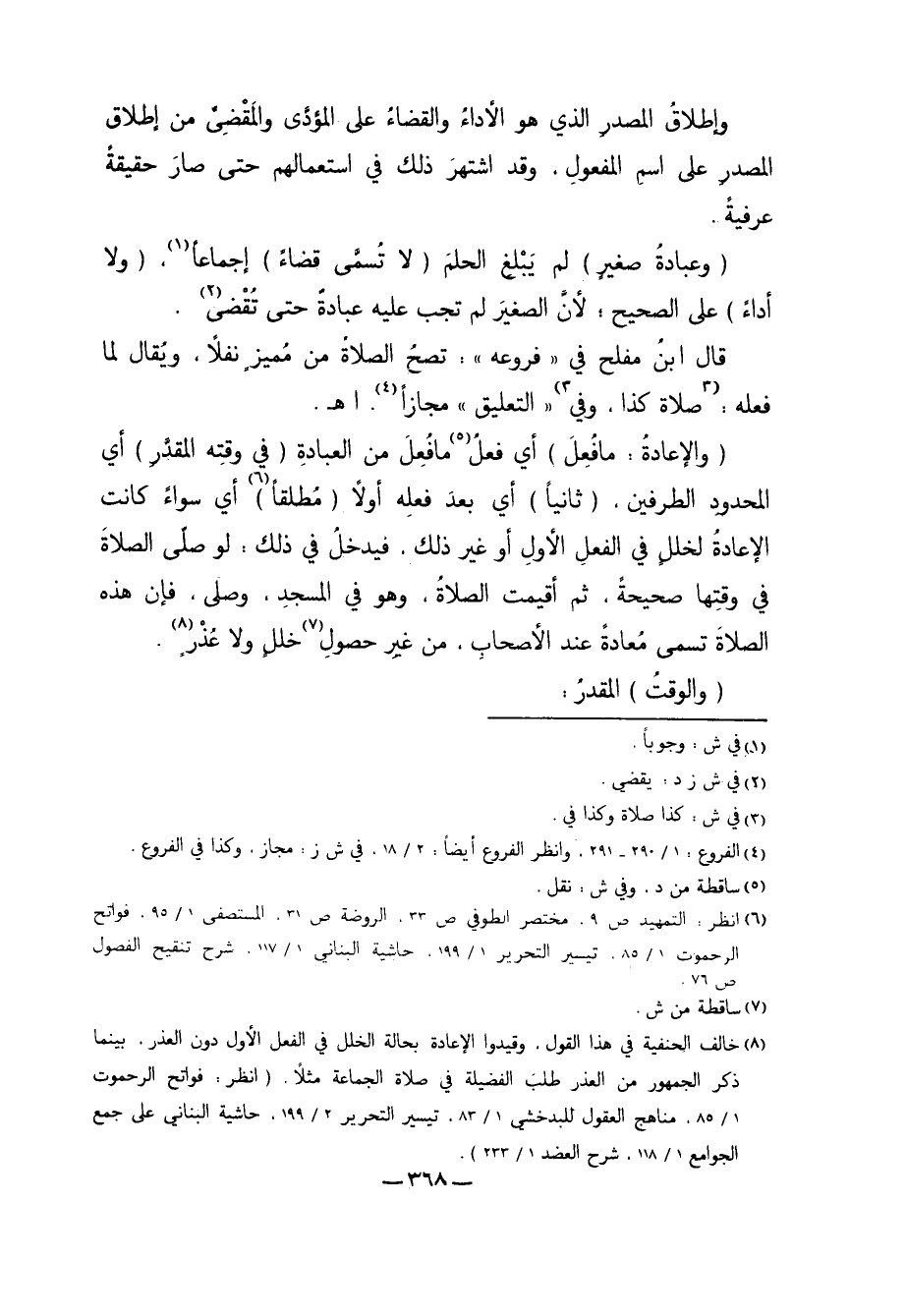 8 خالف الحنفية في هذا القول، وقيدوا الإعادة بحالة الخلل في الفعل الأول دون العذر، بينما ذكر الجمهور من العذر طلب الفضيلة في صلاة الجماعة مثلاً. "انظر: فواتح الرحموت 1/ 85، مناهج العقول للبدخشي 1/ 83، تيسير التحرير 2/ 199، حاشية البناني على جمع الجوامع 1/ 118، شرح العضد 1/ 233".