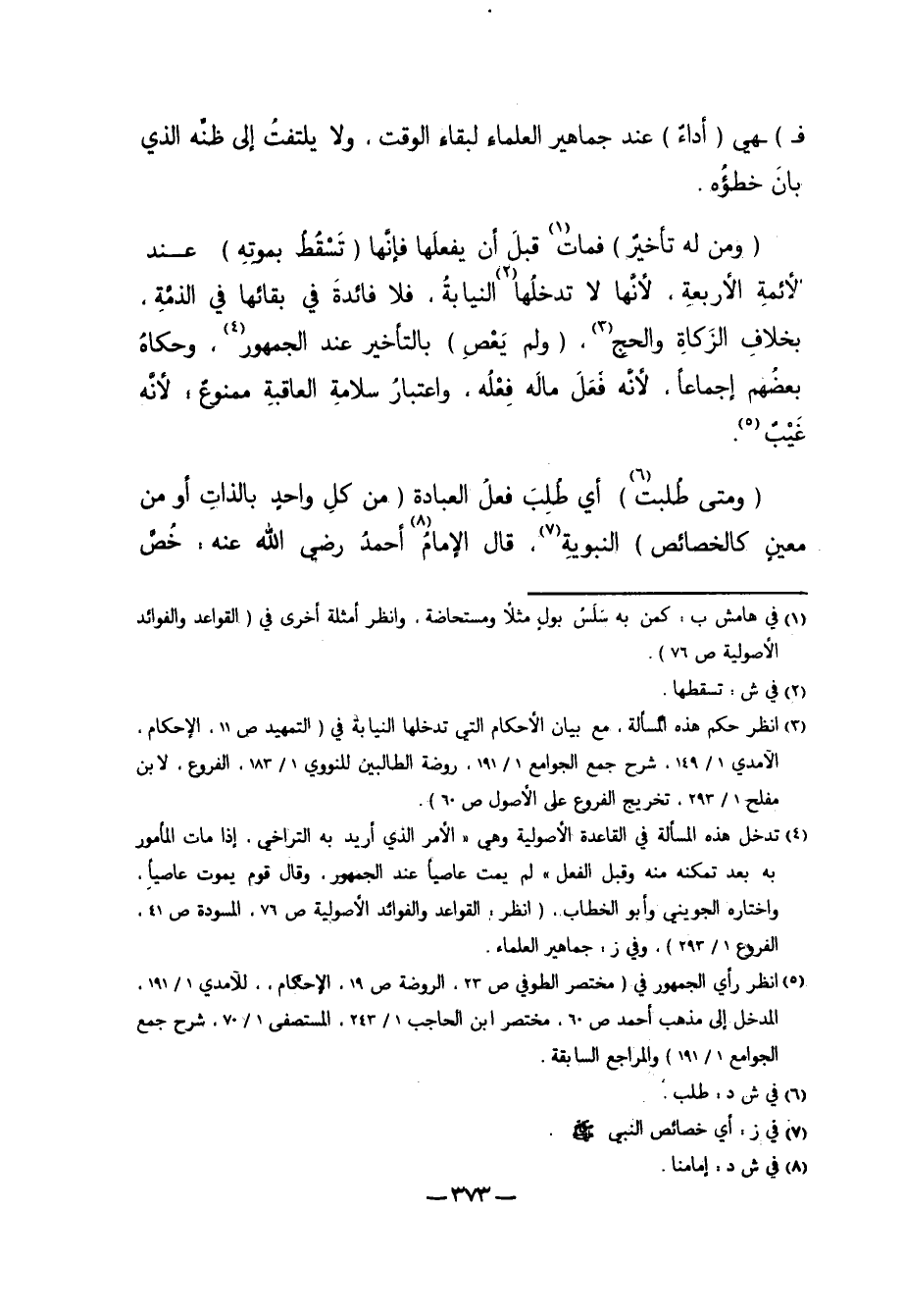 4 تدخل هذه المسألة في القاعدة الأصولية وهي "الأمر الذي أريد به التراخي، إذا مات المأمور به بعد تمكنه منه وقبل الفعل" لم يمت عاصياً عند الجمهور، وقال قوم يموت عاصياً، واختاره الجويني وأبو الخطاب، "انظر: القواعد والفوائد الأصلية ص76، المسودة ص41، الفروع 1/ 293"، وفي ز: جماهير العلماء.