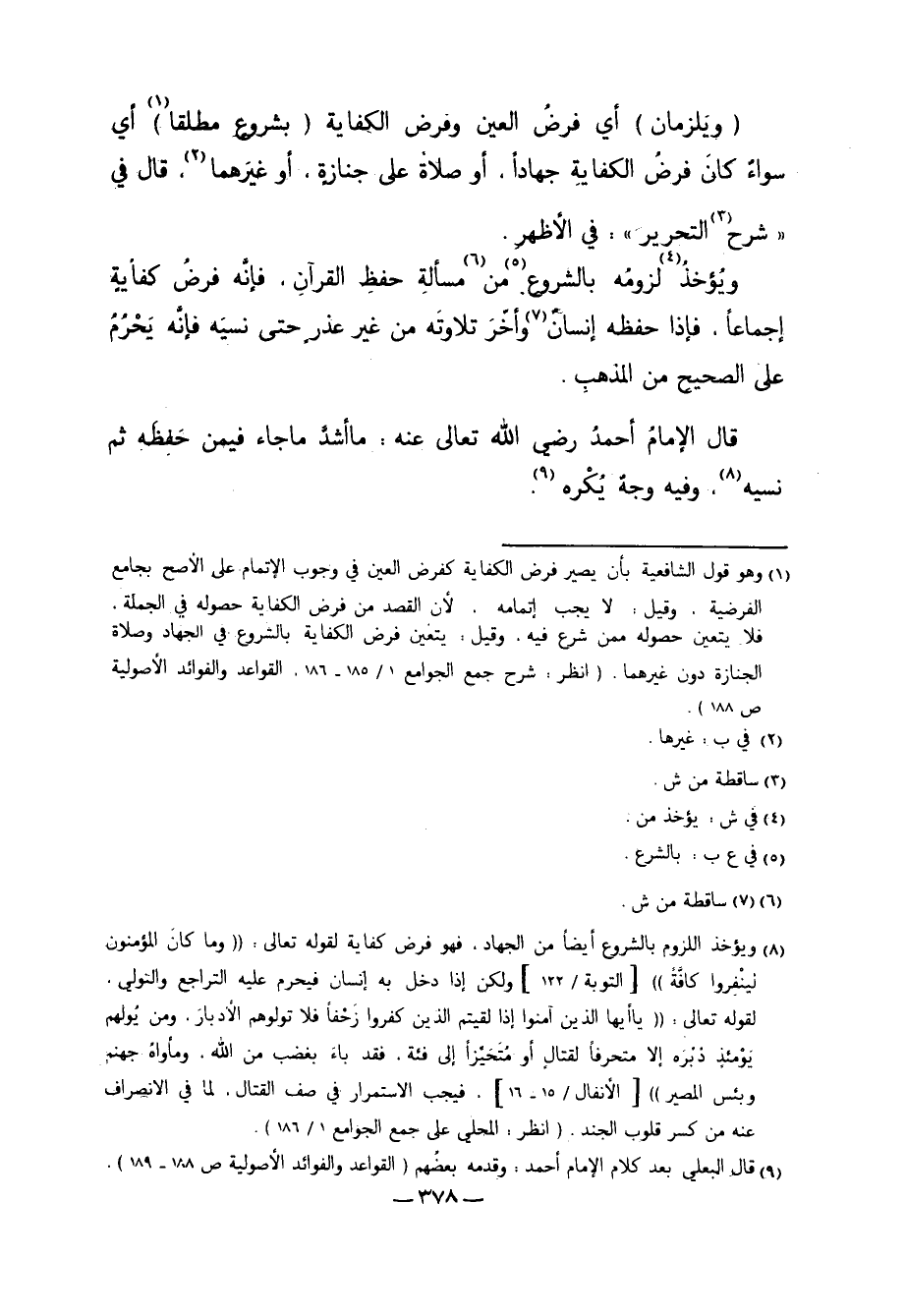 وَيُؤْخَذُ4 لُزُومُهُ بِالشُّرُوعِ5 مِنْ6 مَسْأَلَةِ حِفْظِ الْقُرْآنِ. فَإِنَّهُ فَرْضُ كِفَايَةٍ إجْمَاعًا، فَإِذَا حَفِظَهُ إنْسَانٌ7 وَأَخَّرَ تِلاوَتَهُ مِنْ غَيْرِ عُذْرٍ حَتَّى نَسِيَهُ، فَإِنَّهُ يَحْرُمُ عَلَى الصَّحِيحِ مِنْ الْمَذْهَبِ.