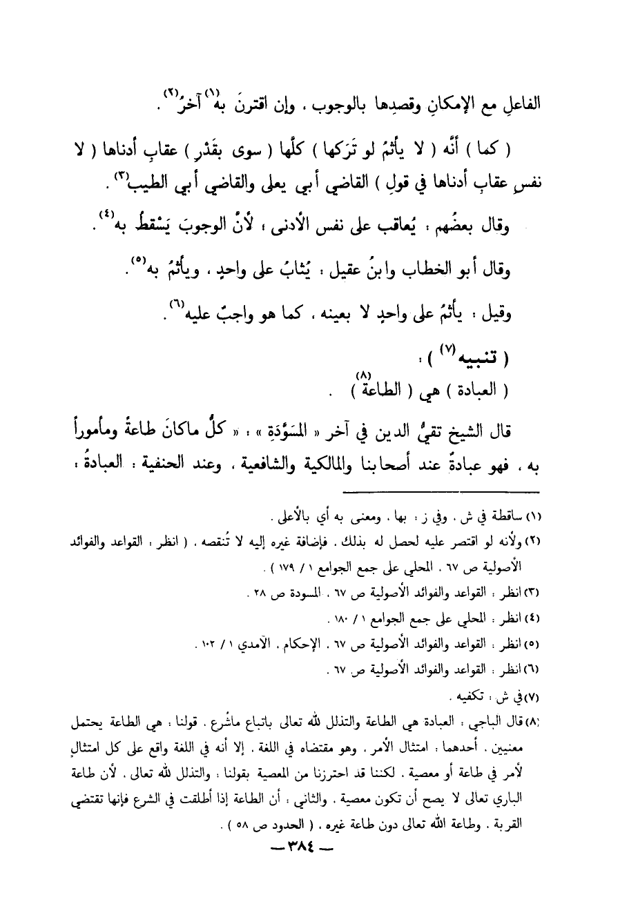 قَالَ الشَّيْخُ تَقِيُّ الدِّينِ فِي آخِرِ "الْمُسَوَّدَةِ": "كُلُّ مَا كَانَ طَاعَةً وَمَأْمُورًا بِهِ، فَهُوَ عِبَادَةٌ عِنْدَ أَصْحَابِنَا وَالْمَالِكِيَّةِ وَالشَّافِعِيَّةِ. وَعِنْدَ الْحَنَفِيَّةِ: الْعِبَادَةُ: