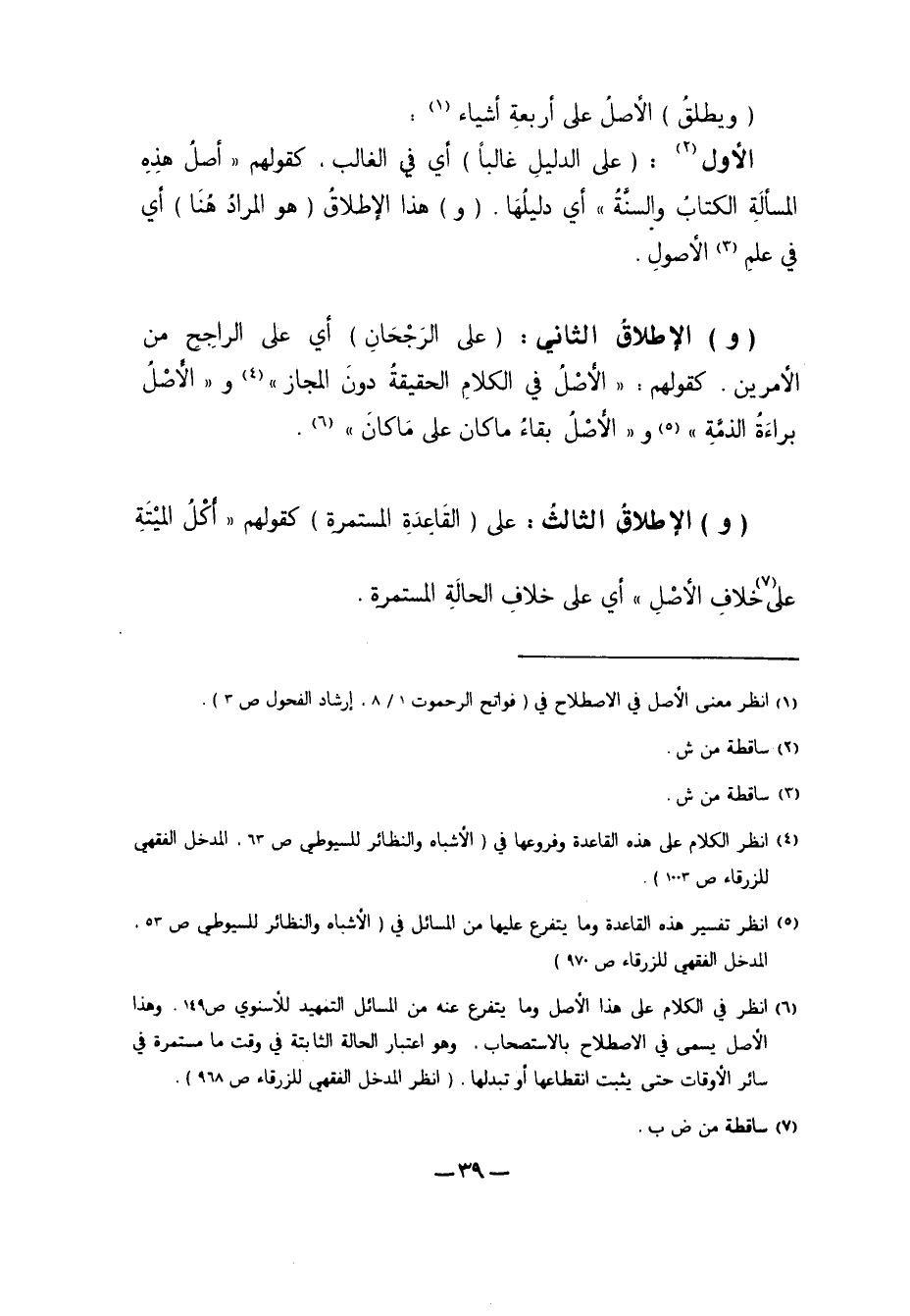 6 انظر في الكلام على هذا الأصل وما يتفرع عنه من المسائل التمهيد الأسنوي ص149. وهذا الأصل يسمى في الاصطلاح بالاستصحاب، وهو اعتبار الحالة الثابتة في وقت ما مستمرة في سائر الأوقات حتى يثبت انقطاعها أو تبدلها. "انظر المدخل الفقهي للزرقاء ص968".