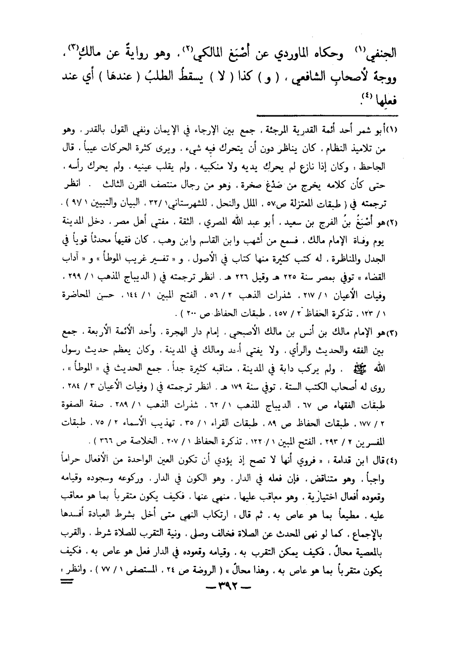 الْحَنَفِيُّ1. وَحَكَاهُ الْمَاوَرْدِيُّ عَنْ أَصَبْغَ الْمَالِكِيِّ2. وَهُوَ رِوَايَةٌ عَنْ مَالِكٍ3. وَوَجْهٌ لأَصْحَابِ الشَّافِعِيِّ، "وَ" كَذَا "لا" يَسْقُطُ الطَّلَبُ "عِنْدَهَا" أَيْ عِنْدَ فِعْلِهَا4.