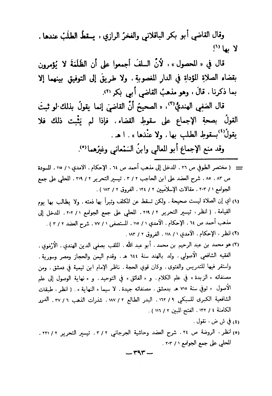 قَالَ الصَّفِيُّ الْهِنْدِيُّ3: "الصَّحِيحُ أَنَّ الْقَاضِيَ إنَّمَا يَقُولُ بِذَلِكَ لَوْ ثَبَتَ الْقَوْلُ بِصِحَّةِ الإِجْمَاعِ عَلَى سُقُوطِ الْقَضَاءِ. فَإِذَا لَمْ يَثْبُتْ ذَلِكَ فَلا يَقُولُ4 بِسُقُوطِ الطَّلَبِ بِهَا، وَلا عِنْدَهَا". انْتَهَى.