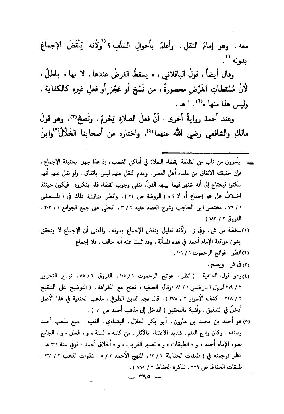 = يأمرون من تاب من الظلمة بقضاء الصلاة في أماكن الغصب، إذ هذا جهل بحقيقة الإجمعاع، فإن حقيقتة الاتفاق من علماء أهل العصر، وعدم النقل عنهم ليس باتفاق، ولو نقل عنهم أنهم سكتوا فيحتاج إلى أنه اشتهر فيما بينهم القولُ ينفي وجوب القضاء فلم ينكروه، فيكون حينئذ اختلاف هل هو إجماع أم لا؟ " "الروضة ص24"، وانظر مناقشة ذلك في "المستصفى 1/ 79، مختصر ابن الحاجب وشرح العضد عليه 2/ 3، المحلي على جمع الجوامع 1/ 203، الفروق 2/ 183".
