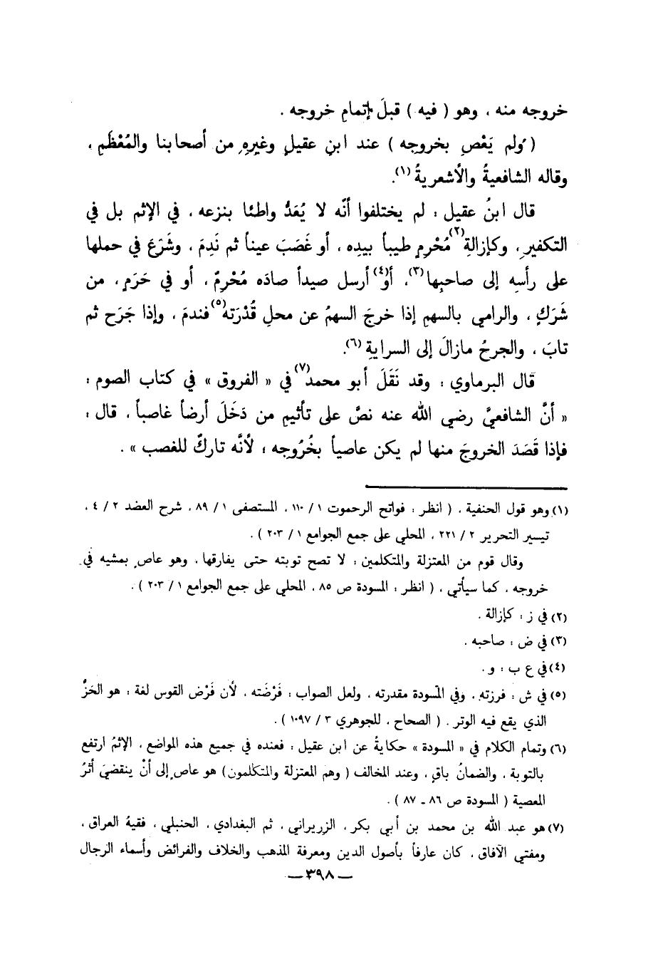 وقال قوم من المعتزلة والمتكلمين، لا تصح توبته حتى يفارقها، وهو عاص بمشية في خروجه، كما سيأتي، "انظر: المسودة ص85، المحلي على جمع الجوامع 1/ 203".