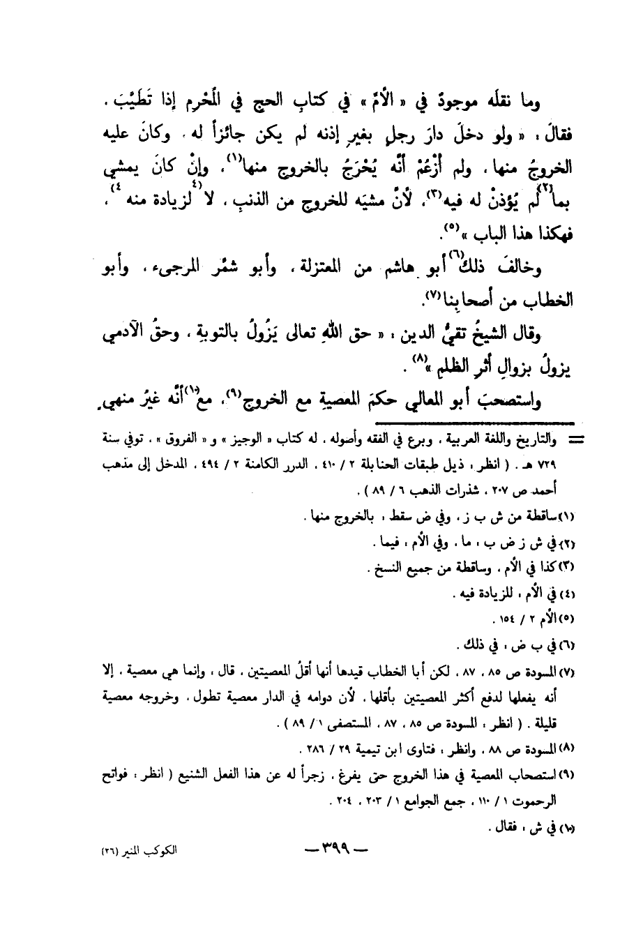 وَاسْتَصْحَبَ أَبُو الْمَعَالِي حُكْمَ الْمَعْصِيَةِ مَعَ الْخُرُوجِ9، مَعَ10 أَنَّهُ غَيْرُ مَنْهِيٍّ