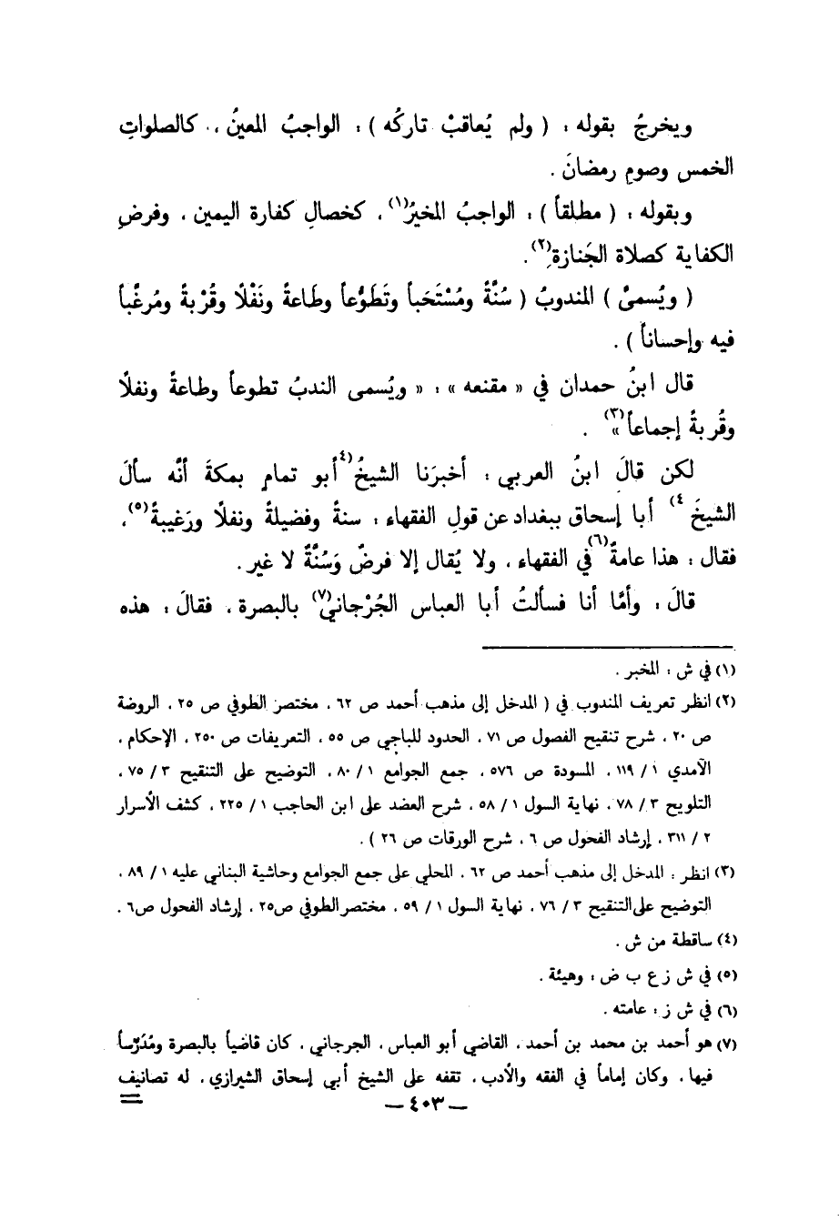 2 انظر تعريف المندوب في "المدخل إلى نذهب أحمد ص62، مختصر الطوفي ص25، الروضة ص20، شرح تنقيح الفصول ص71، الحدود للباجي ص55، التعريفات ص250، الإحكام، الآمدي 1/ 119، المسودة ص576، جمع الجوامع 1/ 80، التوضيح على التنقيح 2/ 75، التلويح 3/ 78، نهاية السول 1/ 58، شرح العضد على ابن الحاجب 1/ 225، كشف الأسرار 2/ 311، إرشاد الفحول ص6، شرح الورقات ص26".