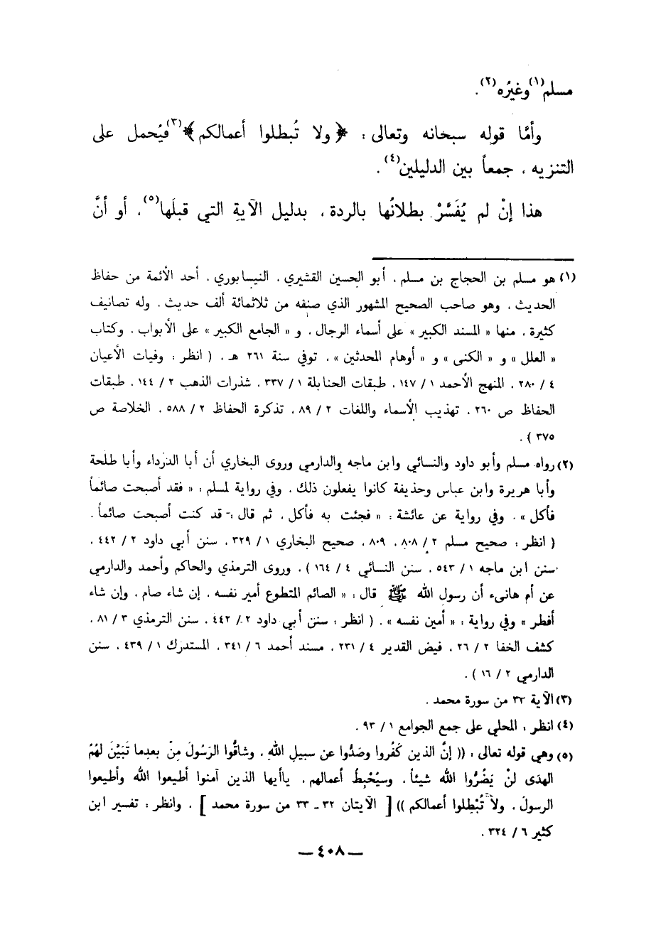 وَأَمَّا قَوْلُهُ سُبْحَانَهُ وَتَعَالَى: {وَلا تُبْطِلُوا أَعْمَالَكُمْ} 3 فَيُحْمَلُ عَلَى التَّنْزِيهِ، جَمْعًا بَيْنَ الدَّلِيلَيْنِ4.