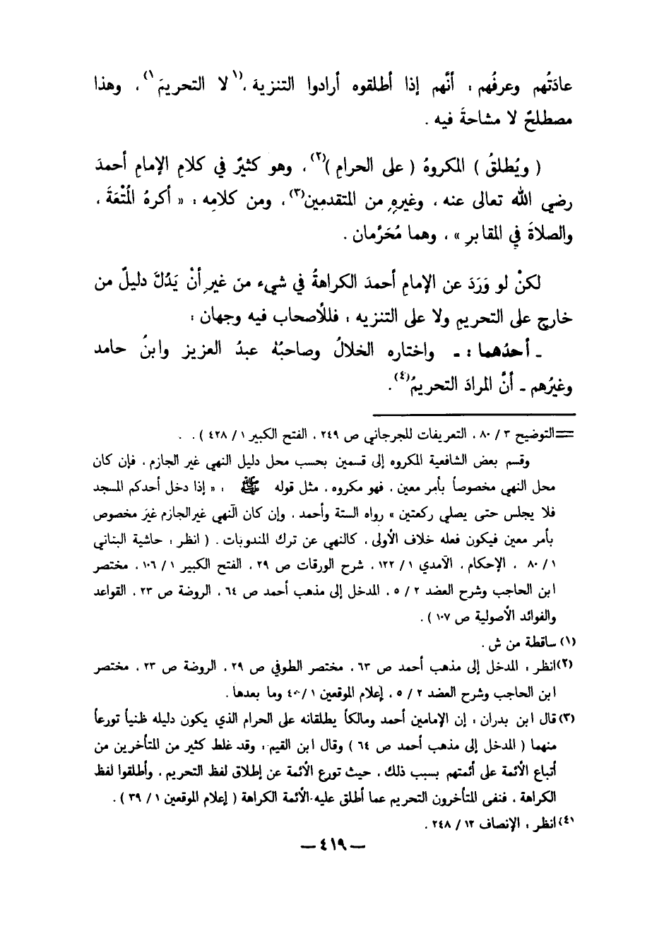 3 قال ابن بدران: إن الإمامين أحمد ومالكاً يطلقانه على الحرام الذي يكون ذليله ظنياً تورعاً منهما "المدخل إلى مذهب أحمد ص64" وقال ابن القيم: وقد غلط كثير من المتأخرين من أتباع الأئمة على أئمتهم بسبب ذلك، حيث تورع الأئمة عن إطلاق لفظ التحريم، وأطلقو لفظ الكراهية، فنفى المتأخرون التحريم عما أطلق عليه الأئمة الكراهية "إعلان الموقعين 1/ 39".