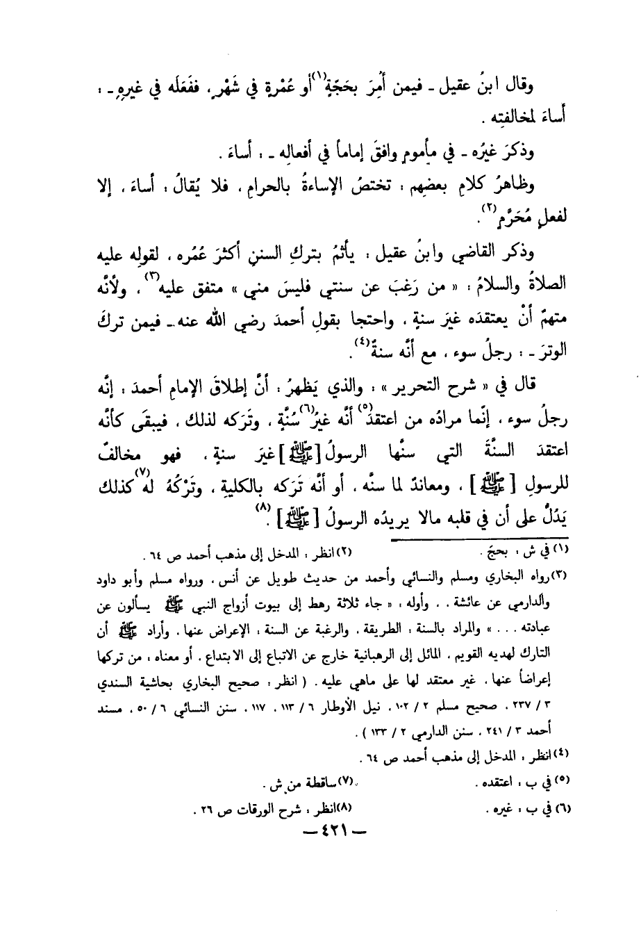 قَالَ فِي "شَرْحِ التَّحْرِيرِ": وَاَلَّذِي يَظْهَرُ: أَنَّ إطْلاقَ الإِمَامِ أَحْمَدَ: أَنَّهُ رَجُلُ سُوءٍ، إنَّمَا مُرَادُهُ مَنْ اعْتَقَدَ5 أَنَّهُ غَيْرُ6 سُنَّةٍ، وَتَرَكَهُ لِذَلِكَ. فَيَبْقَى كَأَنَّهُ اعْتَقَدَ السُّنَّةَ الَّتِي سَنّهَا الرَّسُولُ [صَلَّى اللَّهُ عَلَيْهِ وَسَلَّمَ] غَيْرَ سُنَّةٍ، فَهُوَ مُخَالِفٌ لِلرَّسُولِ [صَلَّى اللَّهُ عَلَيْهِ وَسَلَّمَ] وَمُعَانِدٌ لِمَا سَنَّهُ، أَوْ أَنَّهُ تَرَكَهُ بِالْكُلِّيَّةِ، وَتَرْكُهُ لَهُ7 كَذَلِكَ يَدُلُّ عَلَى أَنَّ فِي قَلْبِهِ مَا لا يُرِيدُهُ الرَّسُولُ [صَلَّى اللَّهُ عَلَيْهِ وَسَلَّمَ] 8.