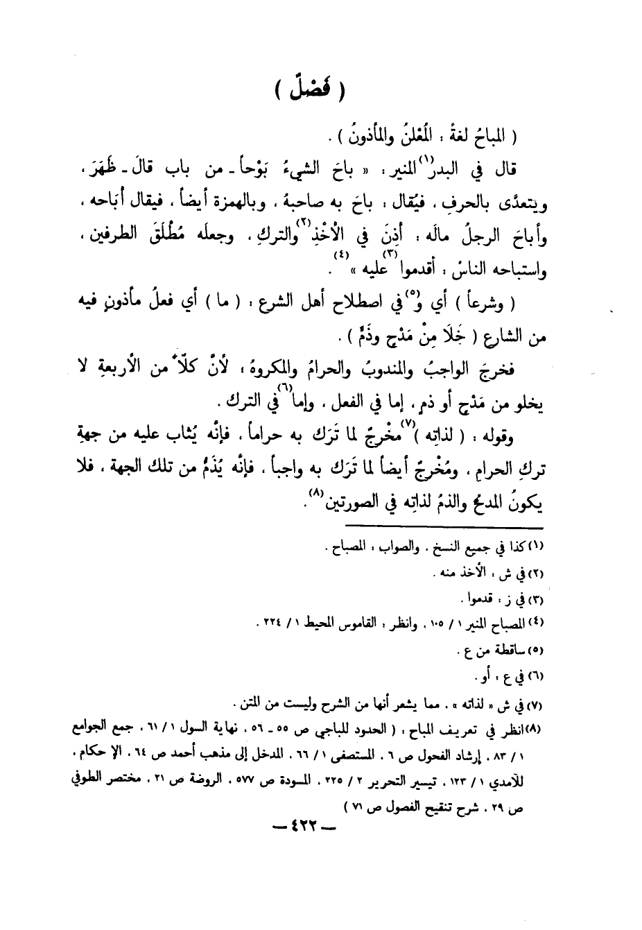 8 انظر في تعريف المباح، "الحدود للباجي ص55-56، نهاية السول 1/ 61، جمع الجوامع 1/ 83، إرشاد الفحول ص6، المستصفى 1/ 66، المدخل إلى مذهب أحمد ص64، الإحكام، الآمدي 1/ 133، تيسير التحرير 2/ 225، المسودة ص557، الروضة ص21، مختصر الطوفي ص29، شرح تنقيح الفصول ص71".