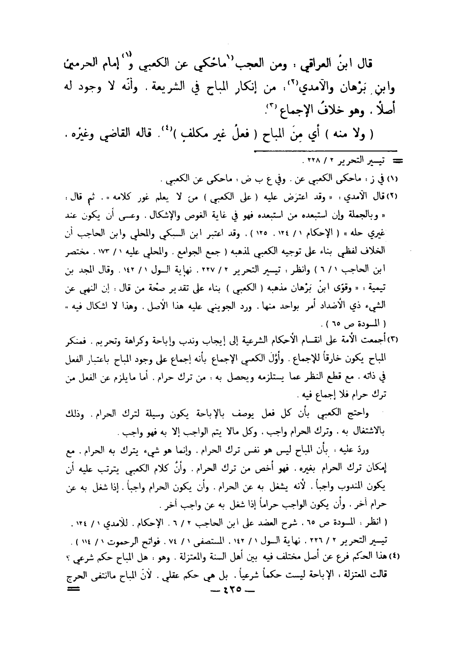 قَالَ ابْنُ الْعِرَاقِيِّ: وَمِنْ الْعَجَبِ 1 مَا حُكِيَ عَنْ الْكَعْبِيِّ وَ 1 إِمَامِ الْحَرَمَيْنِ وَابْنِ بُرْهَانٍ وَالآمِدِيِّ2: مِنْ إنْكَارِ الْمُبَاحِ فِي الشَّرِيعَةِ، وَأَنَّهُ لا وُجُودَ لَهُ أَصْلاً، وَهُوَ خِلافُ الإِجْمَاعِ3.