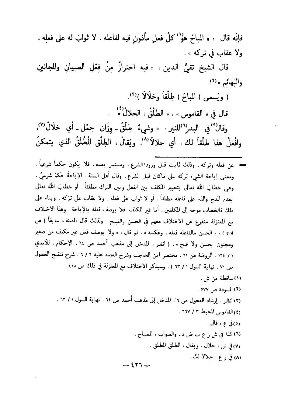 فَإِنَّهُ قَالَ: "الْمُبَاحُ هُوَ1 كُلُّ فِعْلٍ مَأْذُونٍ فِيهِ لِفَاعِلِهِ، لا ثَوَابَ لَهُ عَلَى فِعْلِهِ وَلا عِقَابَ فِي تَرْكِهِ".