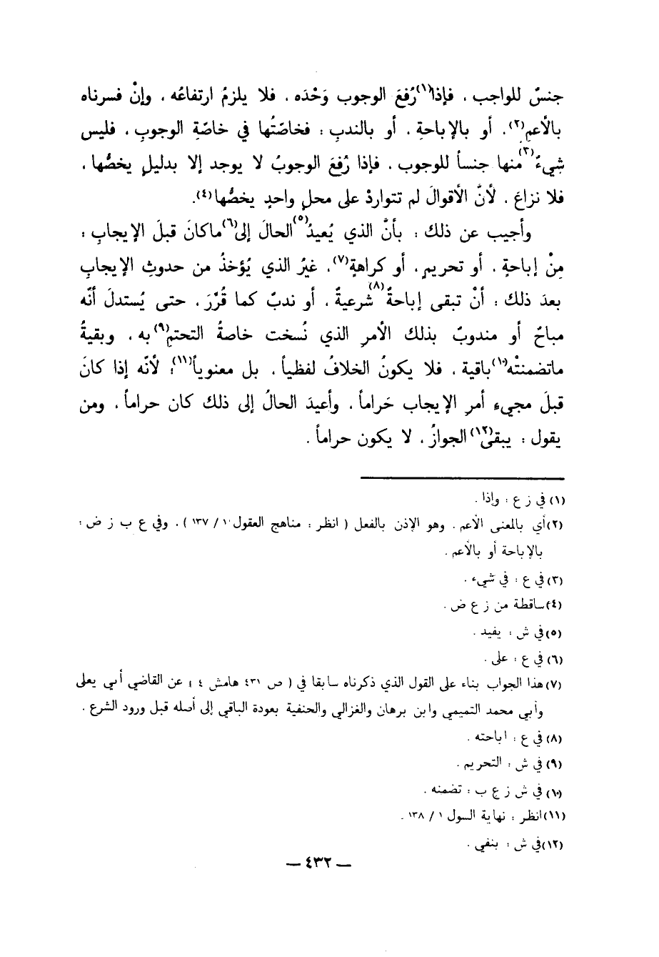 7 هذا الجواب بناء على القول الذي ذكرناه سابقاً في "ص431 هامش 4" عن القاضي أبي يعلى وأبي محمد التميمي وابن برهان والغزالي والحنفية بعودة الباقي إلى أصله قبل ورود الشرع.