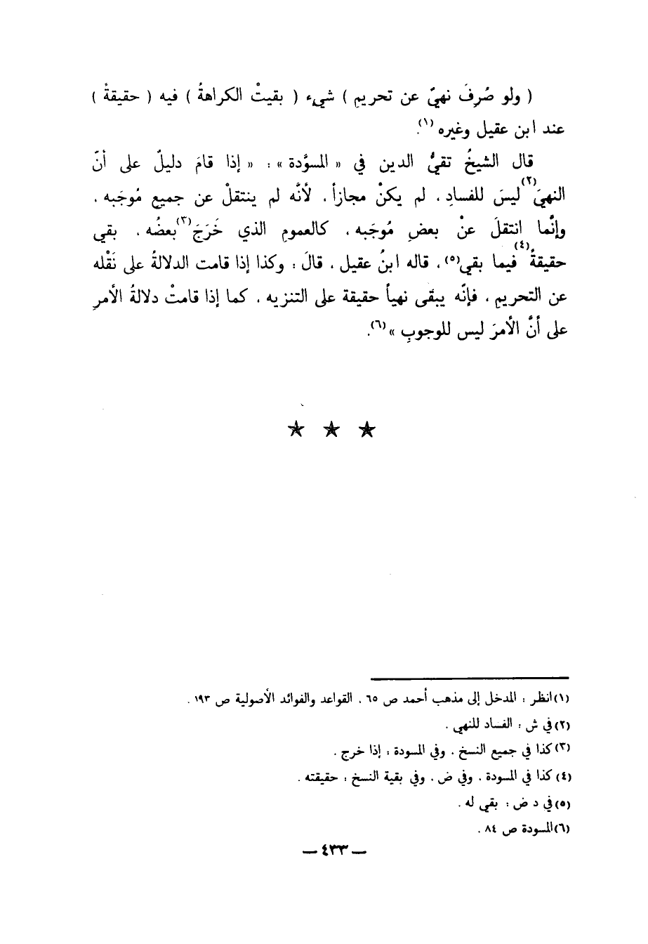 قَالَ الشَّيْخُ تَقِيُّ الدِّينِ فِي "الْمُسَوَّدَةِ": "إذَا قَامَ دَلِيلٌ عَلَى أَنَّ النَّهْيَ2 لَيْسَ لِلْفَسَادِ، لَمْ يَكُنْ مَجَازًا، لأَنَّهُ لَمْ يَنْتَقِلْ عَنْ جَمِيعِ مُوجِبِهِ، وَإِنَّمَا انْتَقَلَ عَنْ بَعْضِ مُوجِبِهِ، كَالْعُمُومِ الَّذِي خَرَجَ3 بَعْضُهُ، بَقِيَ حَقِيقَةً4 فِيمَا بَقِيَ5، قَالَهُ ابْنُ عَقِيلٍ. قَالَ: وَكَذَا إذَا قَامَتْ الدَّلالَةُ عَلَى نَقْلِهِ عَنْ التَّحْرِيمِ، فَإِنَّهُ يَبْقَى نَهْيًا حَقِيقَةً عَلَى التَّنْزِيهِ، كَمَا إذَا قَامَتْ دَلالَةُ الأَمْرِ عَلَى أَنَّ الأَمْرَ لَيْسَ لِلْوُجُوبِ"6.