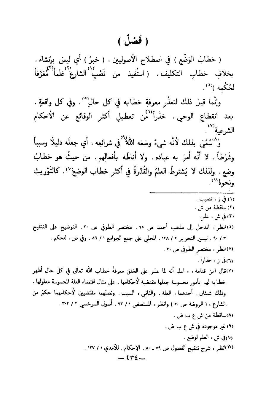4 انظر: المدخل إلى مذهب أحمد ص65، مختصر الطوفي ص30، التوضيح على التنقيح 3/ 90، تيسير التحرير 2/ 128، المحلي على جمع الجوامع 1/ 86، وفي ض: للحكم.