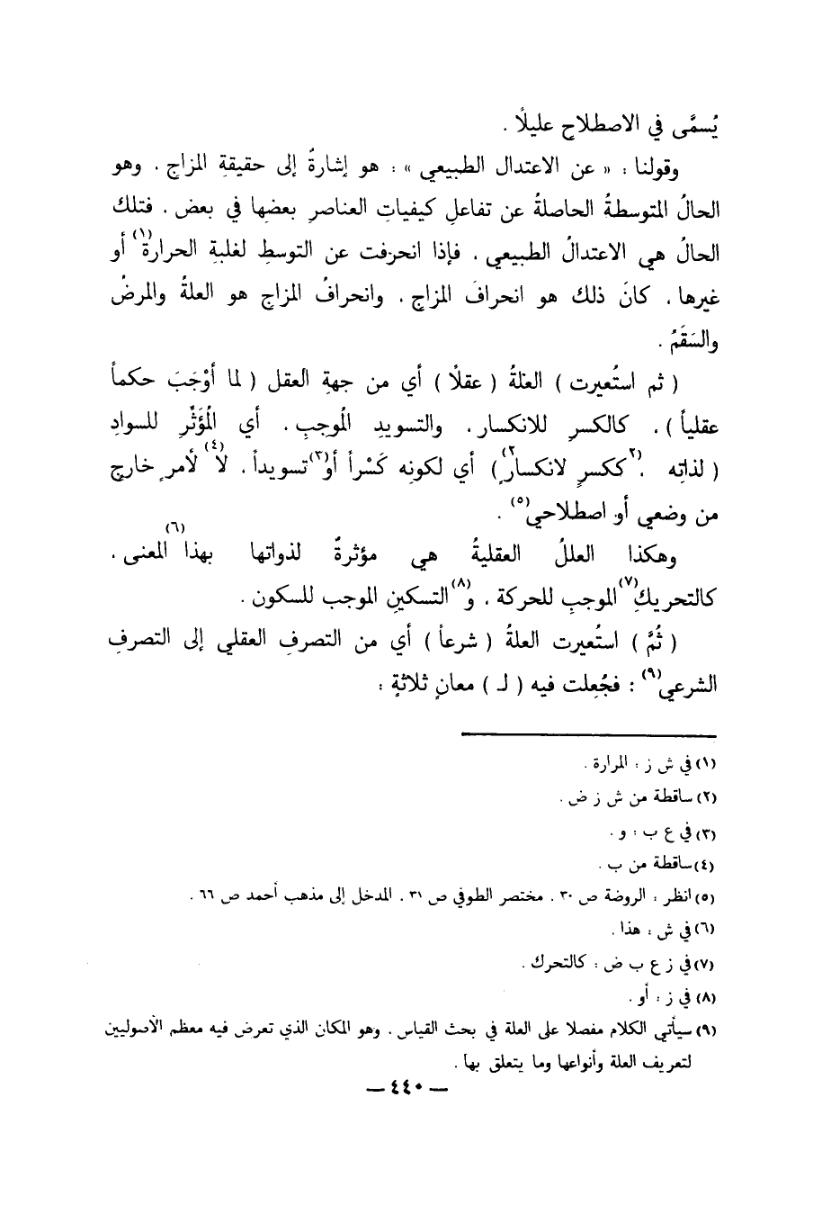 9 سيأتي الكلام مفصلاً على العلة في بحث القياس، وهو المكان الذي تعرض فيه معظم الأصوليين لتعريف العلة وأنواعها وما يتعلق بها.