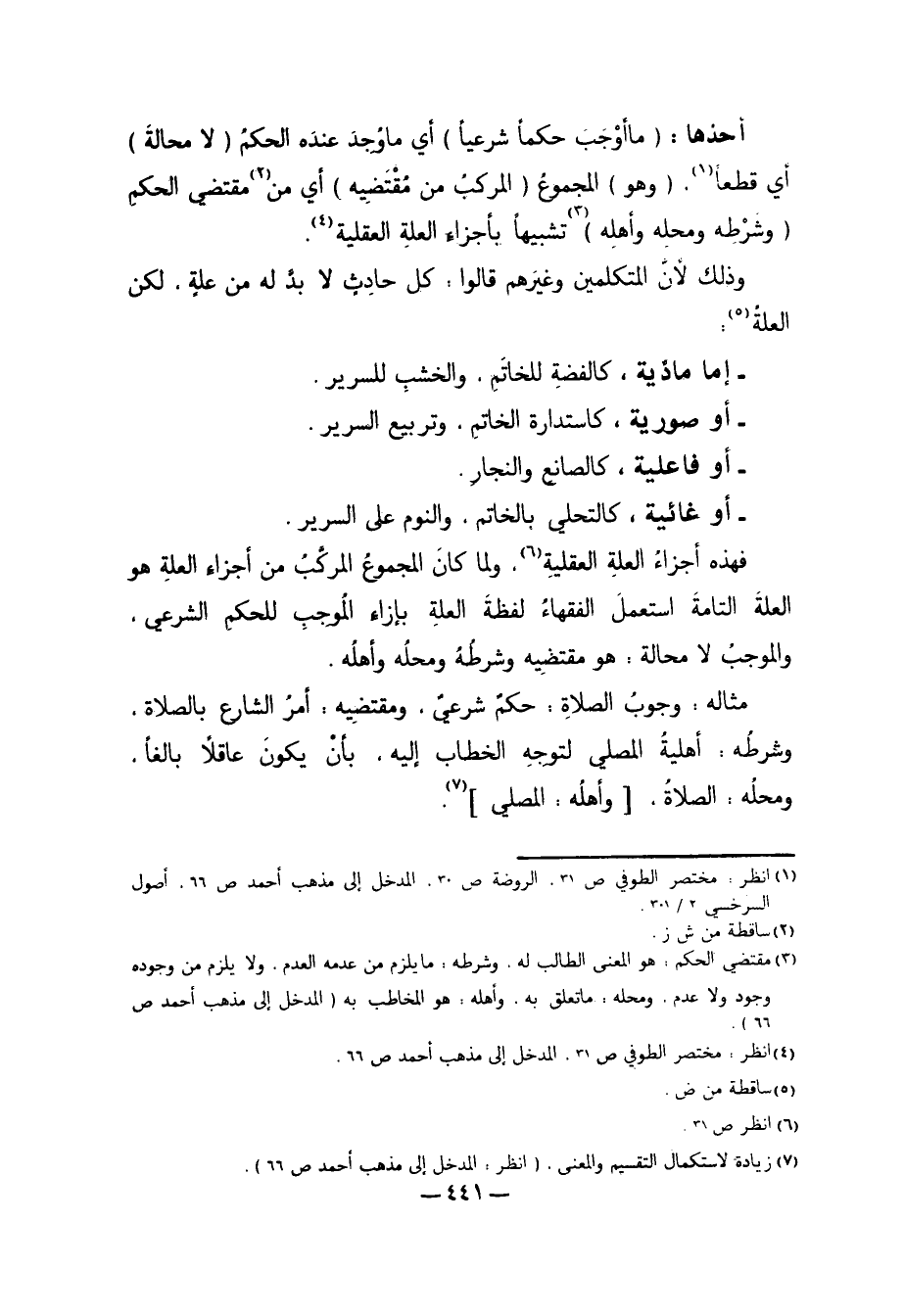 3 مقتضي الحكم: هو المعنى الطالب له، وشرطه: ما يلزم من عدمه العدم، ولا يلزم من وجوده وجود ولا عدم، ومحله: ما تعلق به، وأهله: هو المخاطب به "المدخل إلى مذهب أحمد ص66".