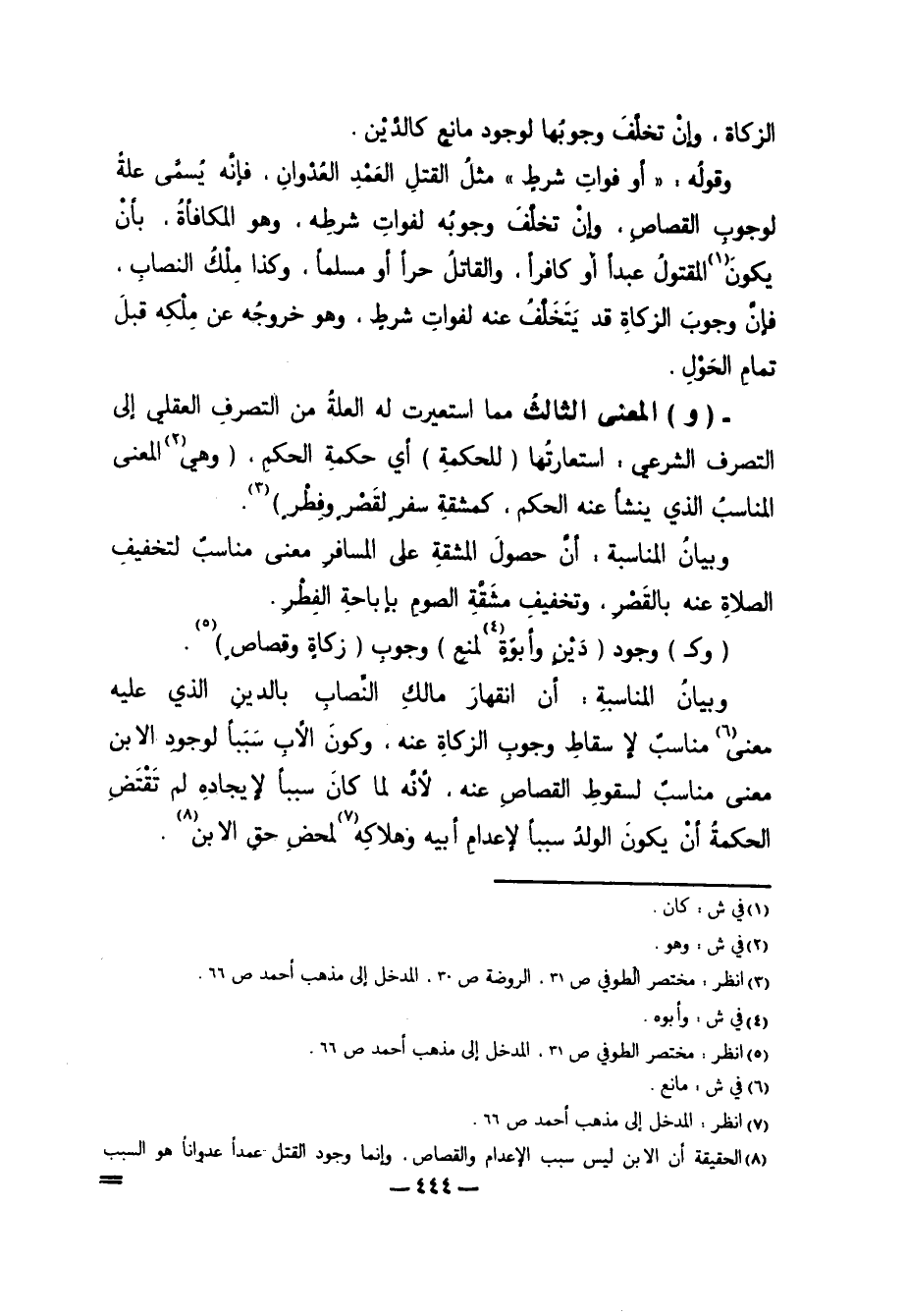 وَقَوْلُهُ: "أَوْ فَوَاتُ شَرْطٍ" مِثْلُ الْقَتْلِ الْعَمْدِ الْعُدْوَانِ. فَإِنَّهُ يُسَمَّى عِلَّةً لِوُجُوبِ الْقِصَاصِ، وَإِنْ تَخَلَّفَ وُجُوبُهُ لِفَوَاتِ شَرْطِهِ، وَهُوَ الْمُكَافَأَةُ، بِأَنْ يكون1 الْمَقْتُولُ عَبْدًا أَوْ كَافِرًا، وَالْقَاتِلُ حُرًّا أَوْ مُسْلِمًا. وَكَذَا مِلْكُ النِّصَابِ، فَإِنَّ وُجُوبَ الزَّكَاةِ قَدْ يَتَخَلَّفُ عَنْهُ لِفَوَاتِ شَرْطٍ، وَهُوَ خُرُوجُهُ عَنْ مِلْكِهِ قَبْلَ تَمَامِ الْحَوْلِ.