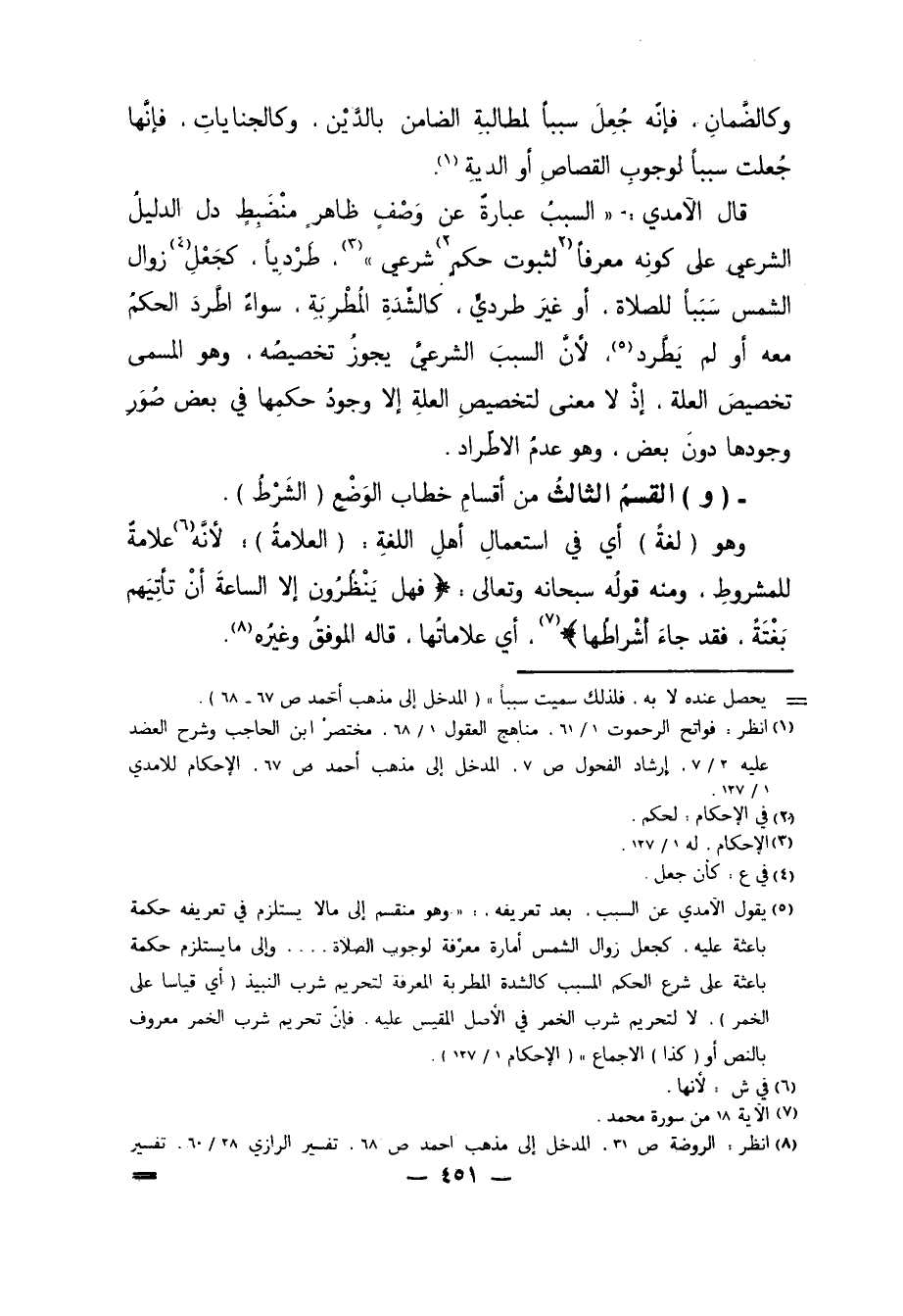 5 يقول الآمدي عن السبب، بعد تعريفه: "وهو منقسم إلى مالا يستلزم في تعريفه حكمةٌ باعثة عليه، كجعل زوال الشمس أمارة معرفة لوجوب الصلاة.... وإلى ما يستلزم حكمة باعثة على شرع الحكم المسبب كالشدة المطربة المعرفة لتحريم شرب النبيذ "أي قياساً على الخمر". لا لتحريم شرب الخمر في الأصل المقيس عليه، فإنّ تحريم شرب الخمر معروف بالنص أو "كذا" الاجماع" "الإحكام 1/ 127".