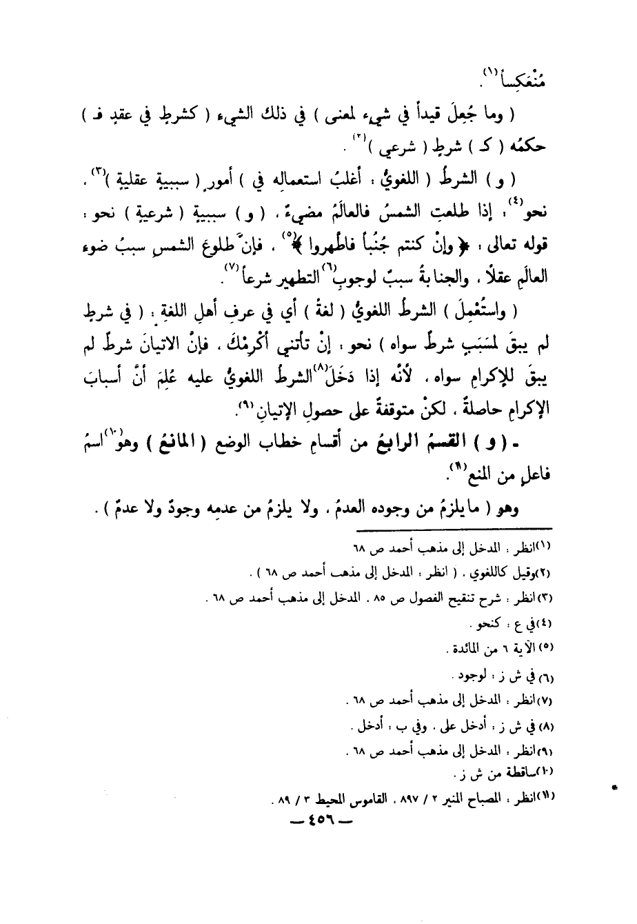 - "وَ" الْقِسْمُ الرَّابِعُ مِنْ أَقْسَامِ خِطَابِ الْوَضْعِ "الْمَانِعُ" وَهُوَ10 اسْمُ فَاعِلٍ مِنْ الْمَنْعِ11.