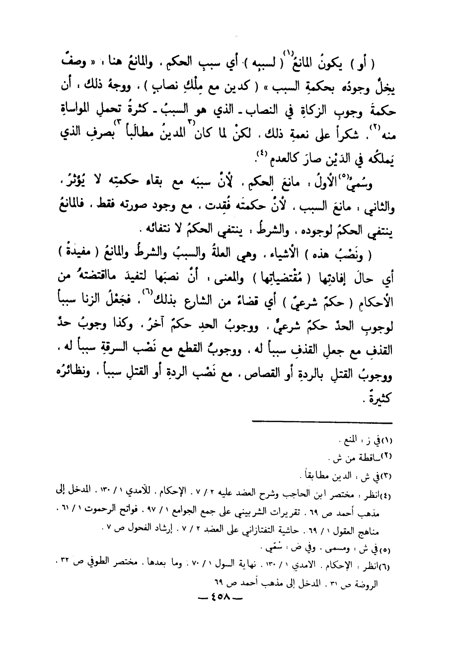 "أَوْ" يَكُونُ الْمَانِعُ1 "لِسَبَبِهِ" أَيْ سَبَبِ الْحُكْمِ، وَالْمَانِعُ هُنَا: "وَصْفٌ يُخِلُّ وُجُودُهُ بِحِكْمَةِ السَّبَبِ" "كَدَيْنٍ مَعَ مِلْكِ نِصَابٍ"، وَوَجْهُ ذَلِكَ: أَنَّ حِكْمَةَ وُجُوبِ الزَّكَاةِ فِي النِّصَابِ - الَّذِي هُوَ السَّبَبُ- كَثْرَةُ تَحَمُّلِ الْمُوَاسَاةِ مِنْهُ2، شُكْرًا عَلَى نِعْمَةِ ذَلِكَ، لَكِنْ لَمَّا كَانَ 3 الْمَدِينُ مُطَالَبًا 3 بِصَرْفِ الَّذِي يَمْلِكُهُ فِي الدَّيْنِ صَارَ كَالْعَدَمِ4.