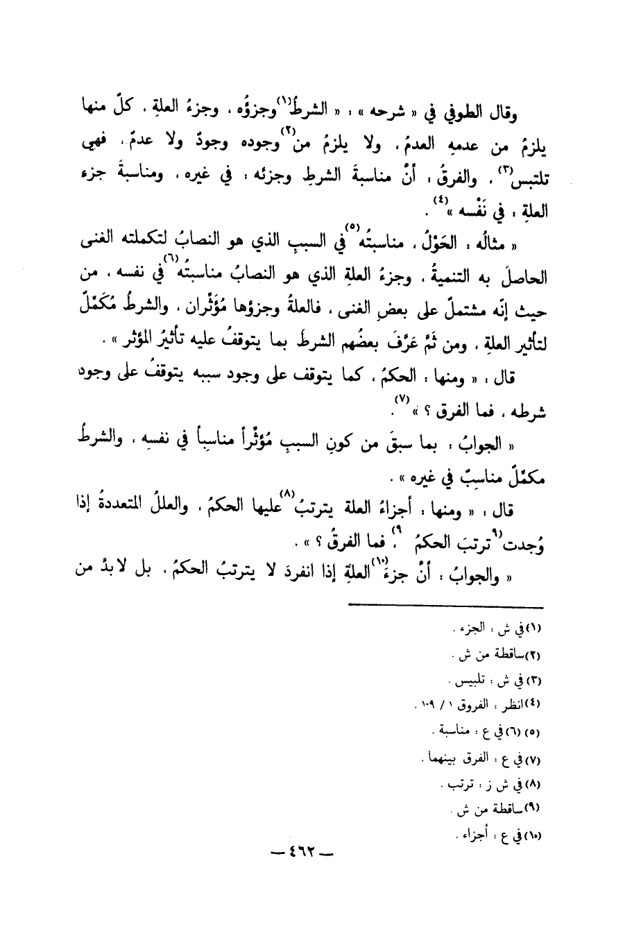 وَقَالَ الطُّوفِيُّ فِي "شَرْحِهِ": الشَّرْطُ1 وَجُزْؤُهُ وَجُزْءُ الْعِلَّةِ، كُلٌّ مِنْهَا يَلْزَمُ مِنْ عَدَمِهِ الْعَدَمُ، وَلا يَلْزَمُ مِنْ2 وُجُودِهِ وُجُودٌ وَلا عَدَمٌ. فَهِيَ تَلْتَبِسُ3، وَالْفَرْقُ: أَنَّ مُنَاسَبَةَ الشَّرْطِ وَجُزْئِهِ: فِي غَيْرِهِ. وَمُنَاسَبَةَ جُزْءِ الْعِلَّةِ: فِي نَفْسِهِ"4.