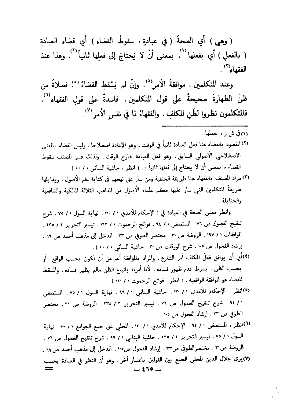 2 المقصود بالقضاء هنا فعل العبادة ثانياً في الوقت، وهو الإعادة اصطلاحا، وليس القضاء بالمعنى الاصطلاحي الأصولي السابق، وهو فعل العبادة خارج الوقت، ولذلك فسر المصنف سقوط القضاء "بمعنى أن لا يحتاج إلى فعلها ثانياً". "انظر: حاشية البناني 1/ 100".
