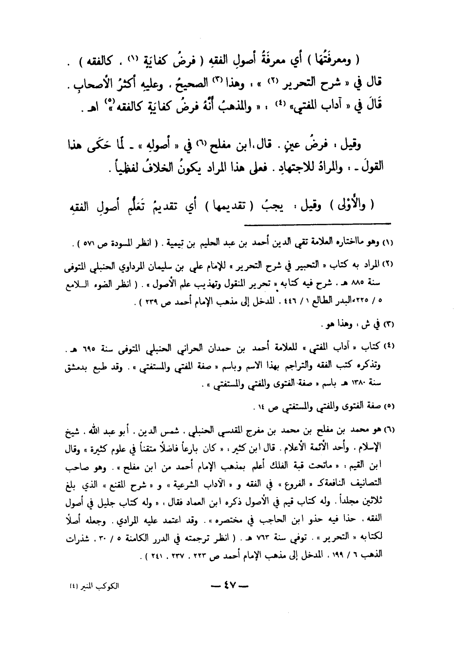 "وَمَعْرِفَتُهَا" أَيْ: مَعْرِفَةُ أُصُولِ الْفِقْهِ "فَرْضُ كِفَايَةٍ1، كَالْفِقْهِ" قَالَ فِي "شَرْحِ التَّحْرِيرِ2": وَهَذَا3 الصَّحِيحُ، وَعَلَيْهِ أَكْثَرُ الأَصْحَابِ. قَالَ فِي "آدَابِ الْمُفْتِي"4: "وَالْمَذْهَبُ أَنَّهُ فَرْضُ كِفَايَةٍ كَالْفِقْهِ"5 اهـ.